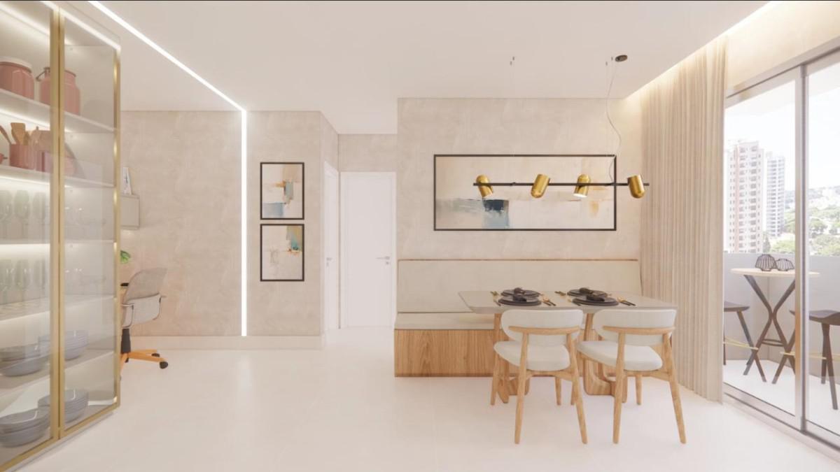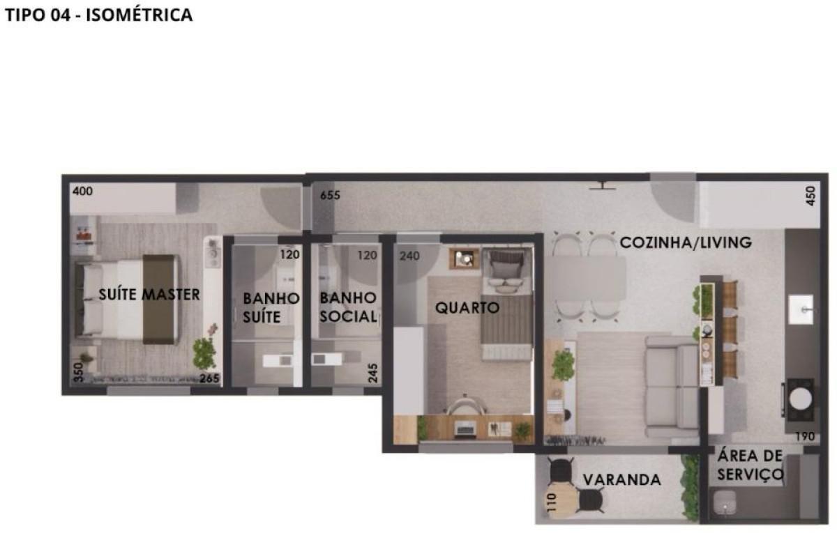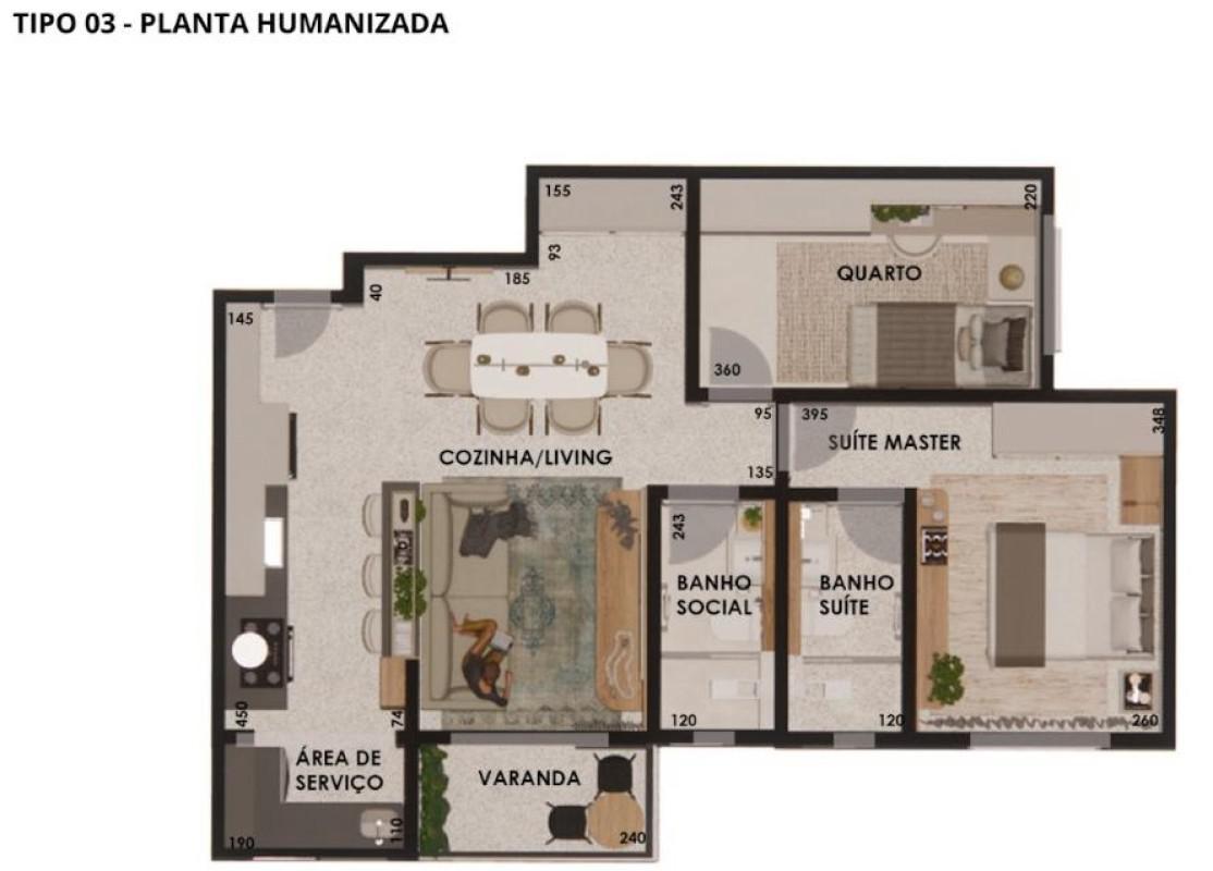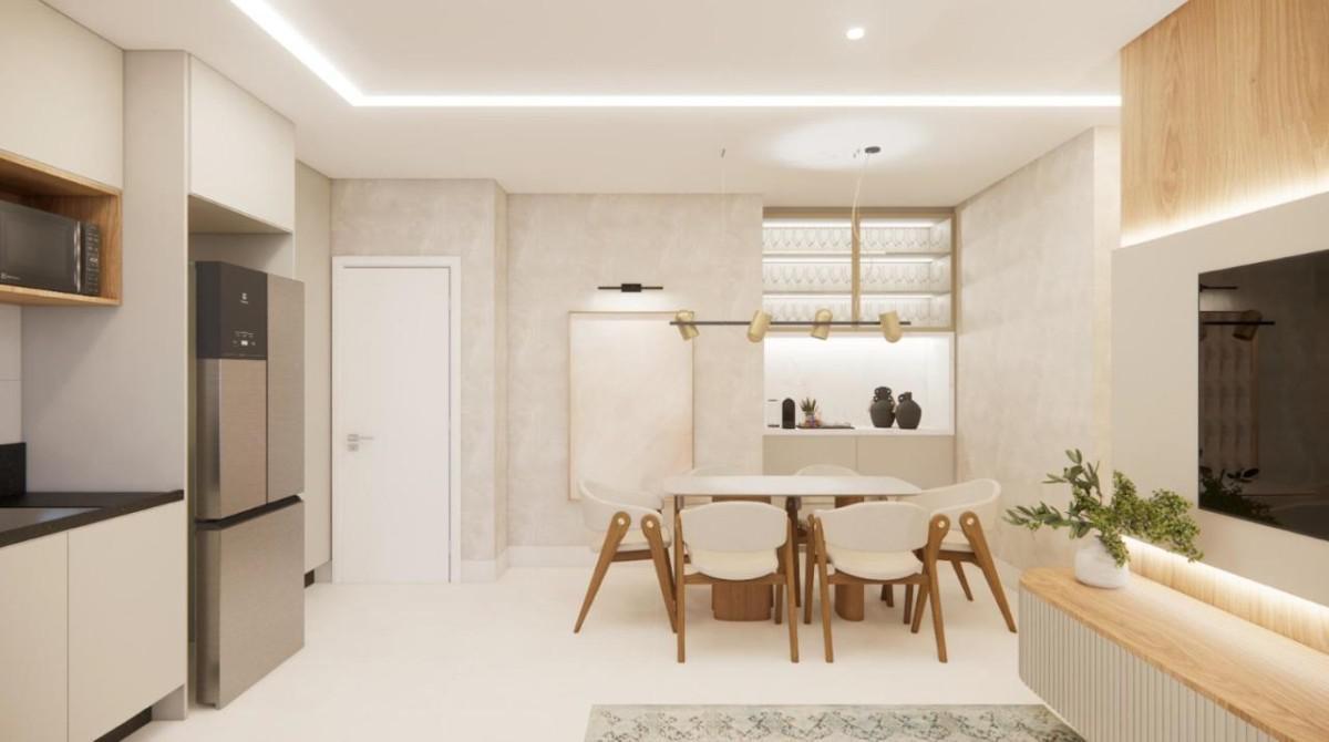 Apartamentos tipo de 60,10 a 62,45 m² de área total interna, com 2 quartos, 1 suíte, 1 banho social, sala para 2 ambientes integrada cozinha e área de serviço, 01 vaga de garagem.