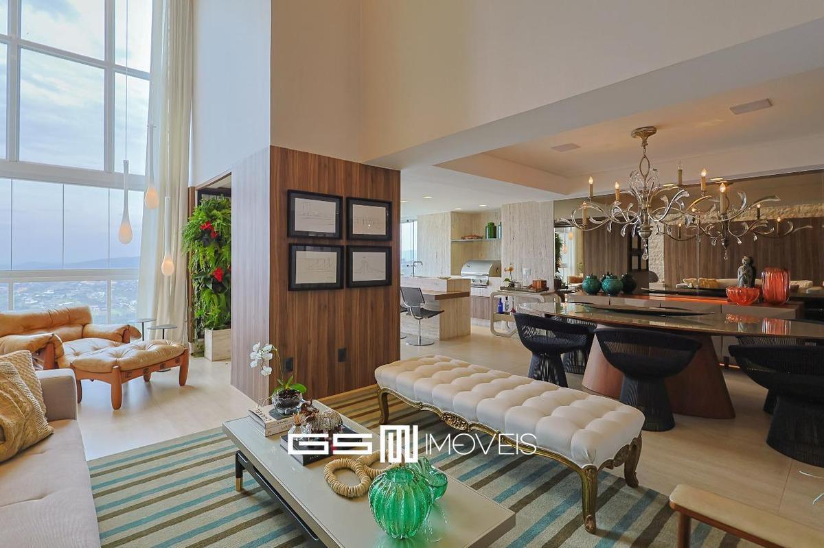 Sala de estar com pé-direito duplo, varanda gourmet, andar alto com vista panorâmica.