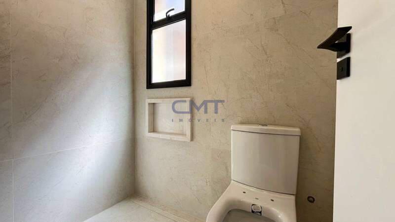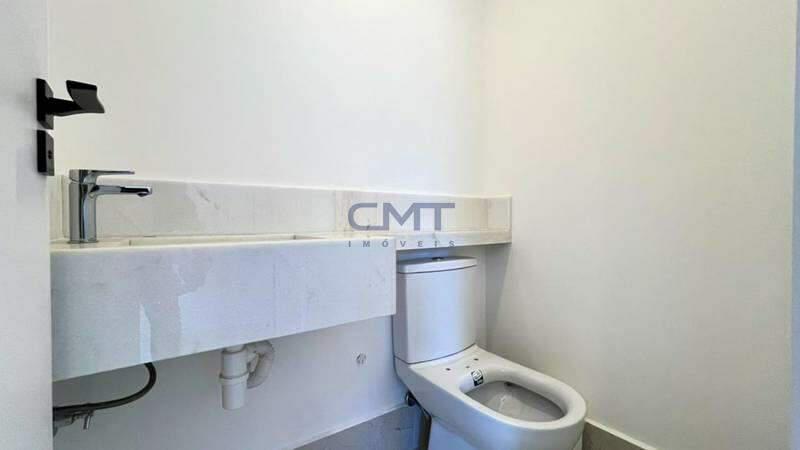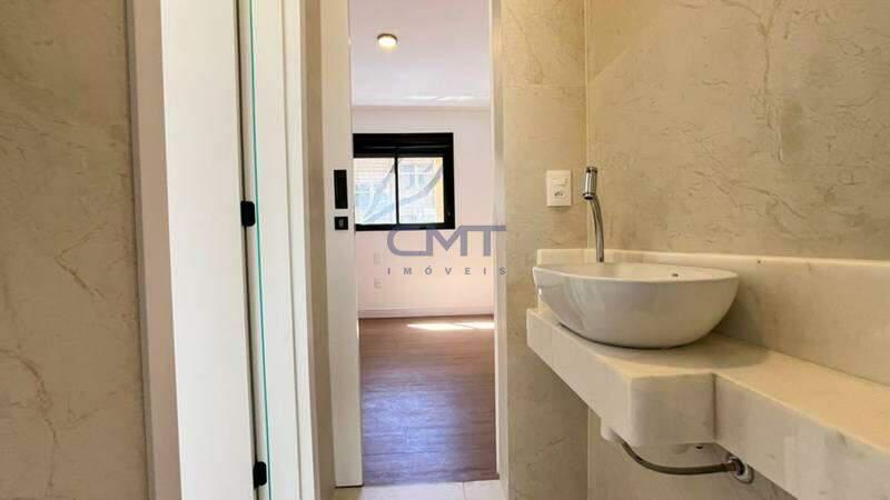 3 quartos amplos, todos com atenuação de ruídos, piso vinílico de madeira, sendo uma suíte com bancada em mármore branco e piso em porcelanato, e duas semi-ssuítes com piso em porcelanato e pia em cuba de apoio; o banheiro tem porta de acesso para os dois quartos