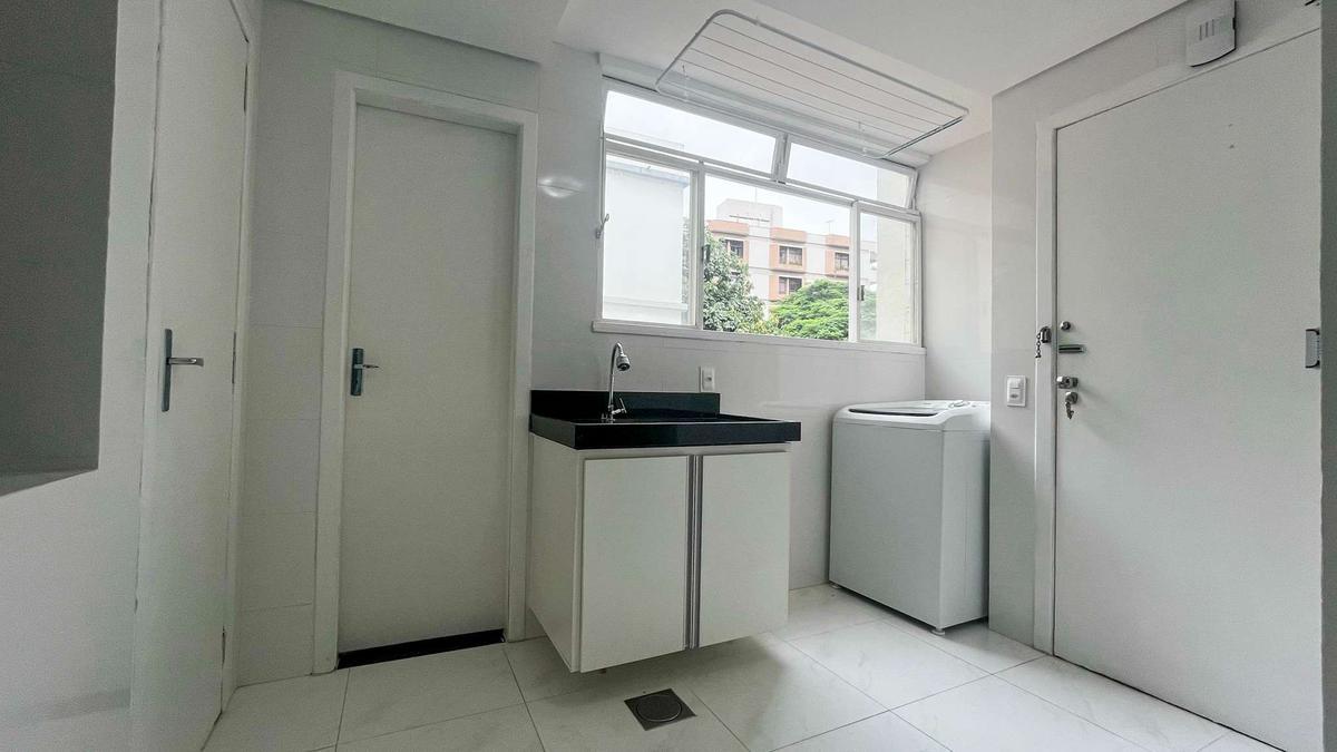 Área de serviço espaçosa com armário e pia.