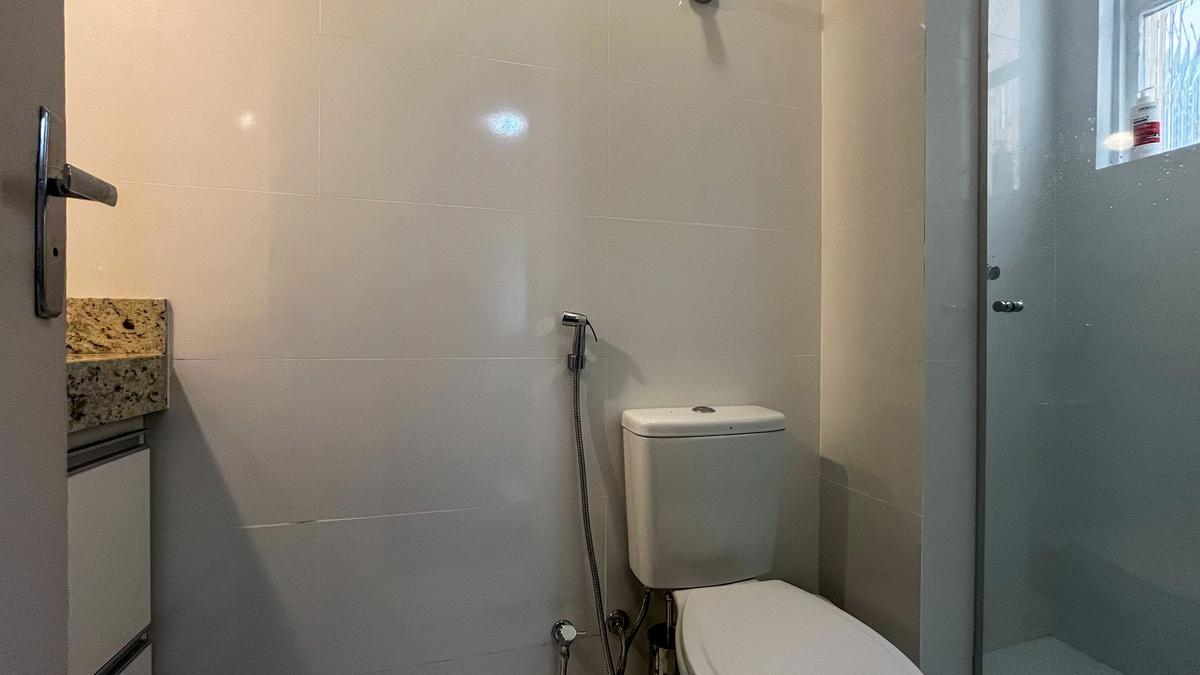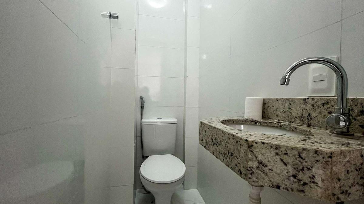 Banheiro social com pia em granito.