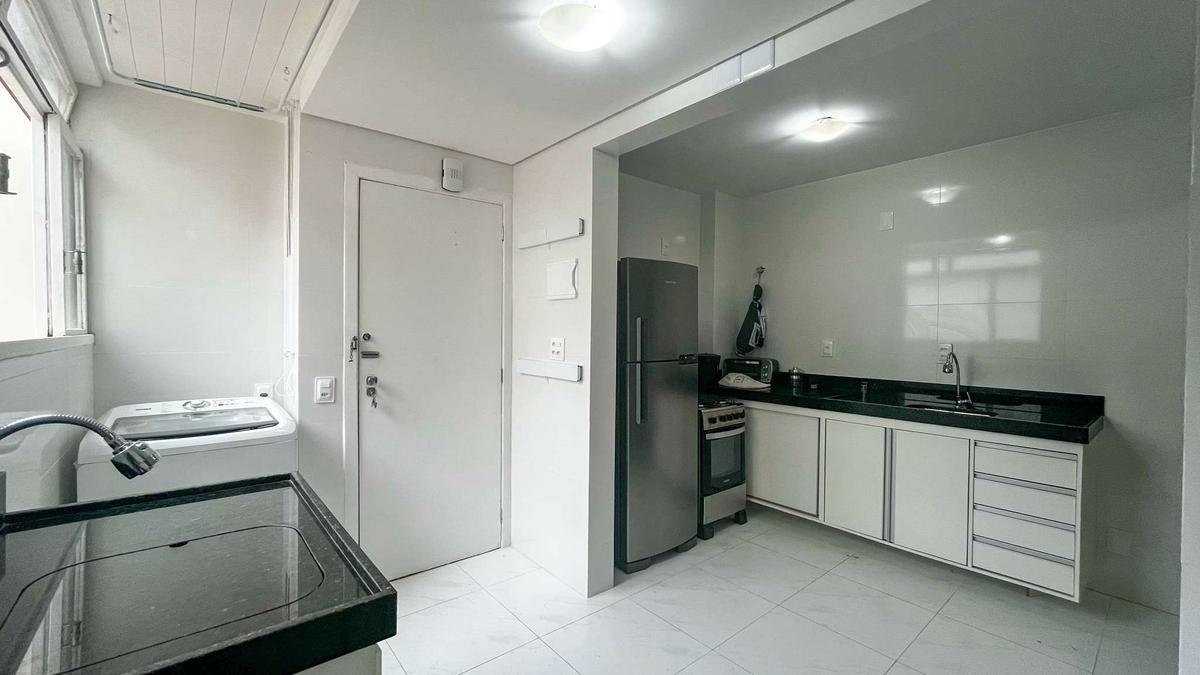 Cozinha com piso em porcelanato, armários embutidos e bancada em granito.