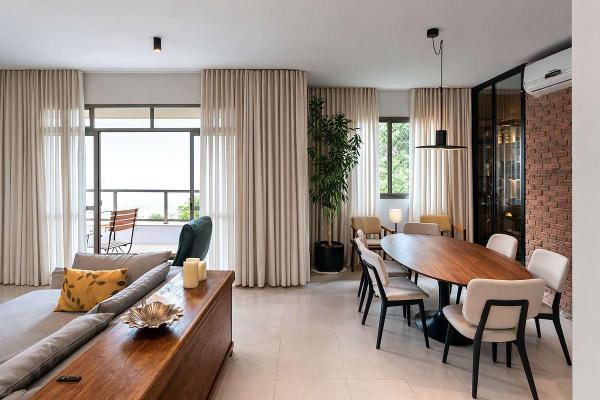 Sala para 02 ambientes, com piso em porcelanato, teto em gesso, projeto de iluminação da A de Arte, ar-condicionado, adega e varanda integrada.