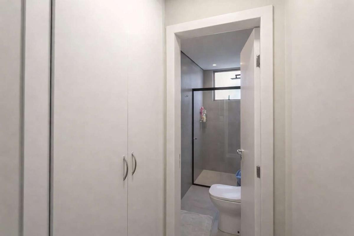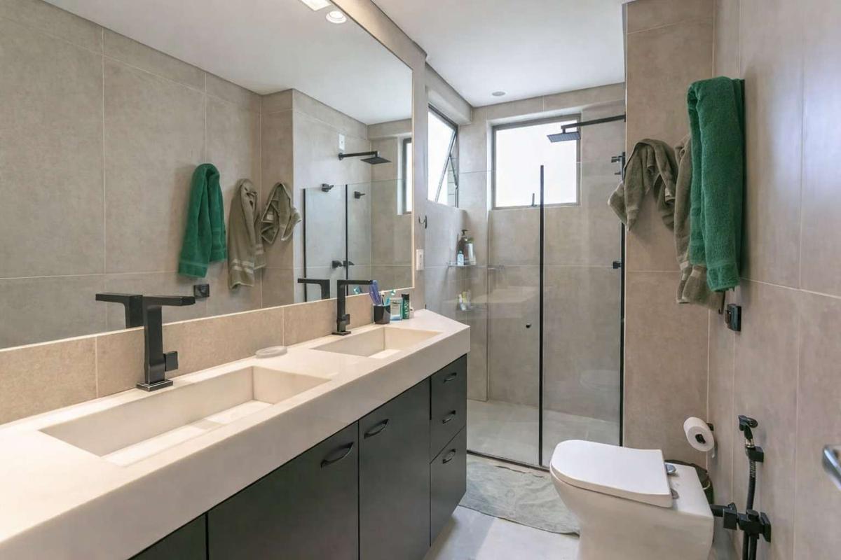 Banheiros (social e suíte) com box em blindex, armários e espelhos.
