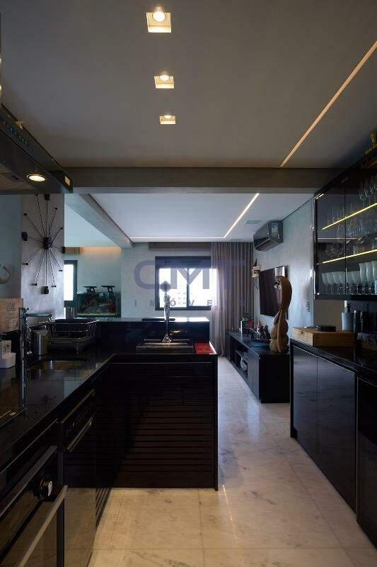 Cozinha americana com piso em mármore e bancadas em granito. Armários planejados, depurador de ar e chopeira. Quarto e banheiro de serviço.