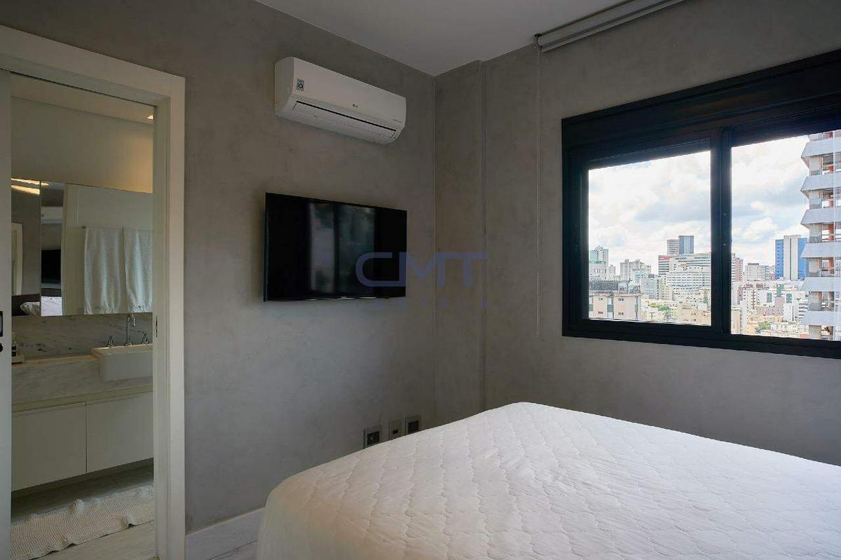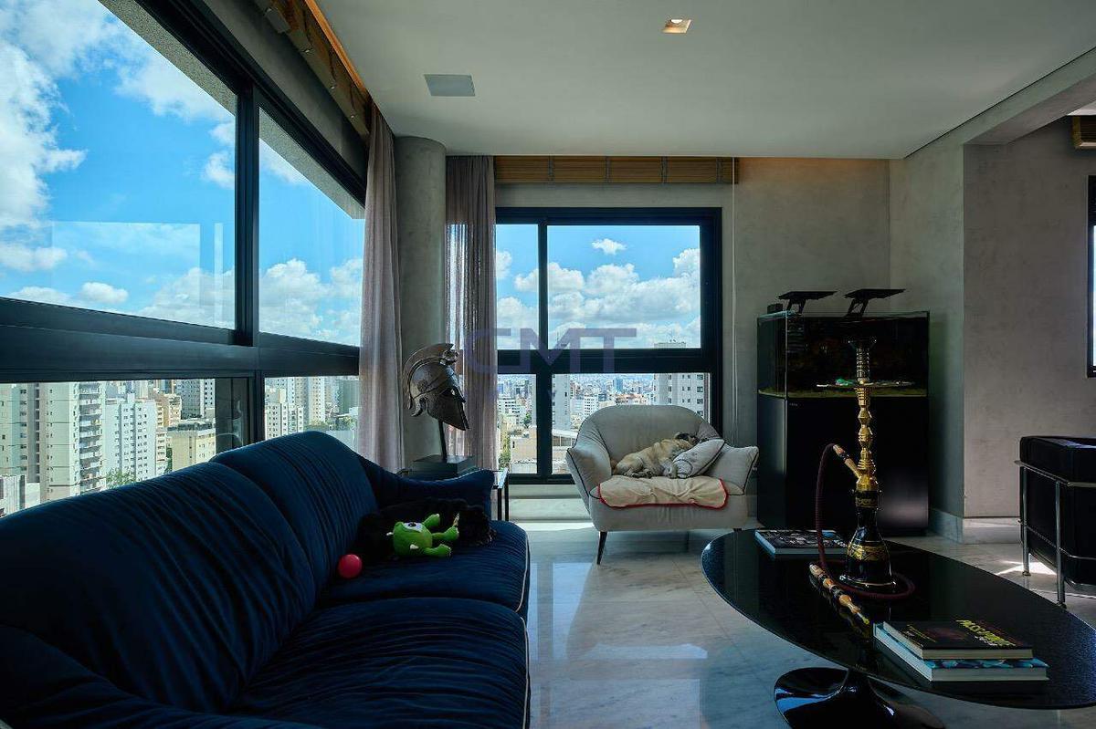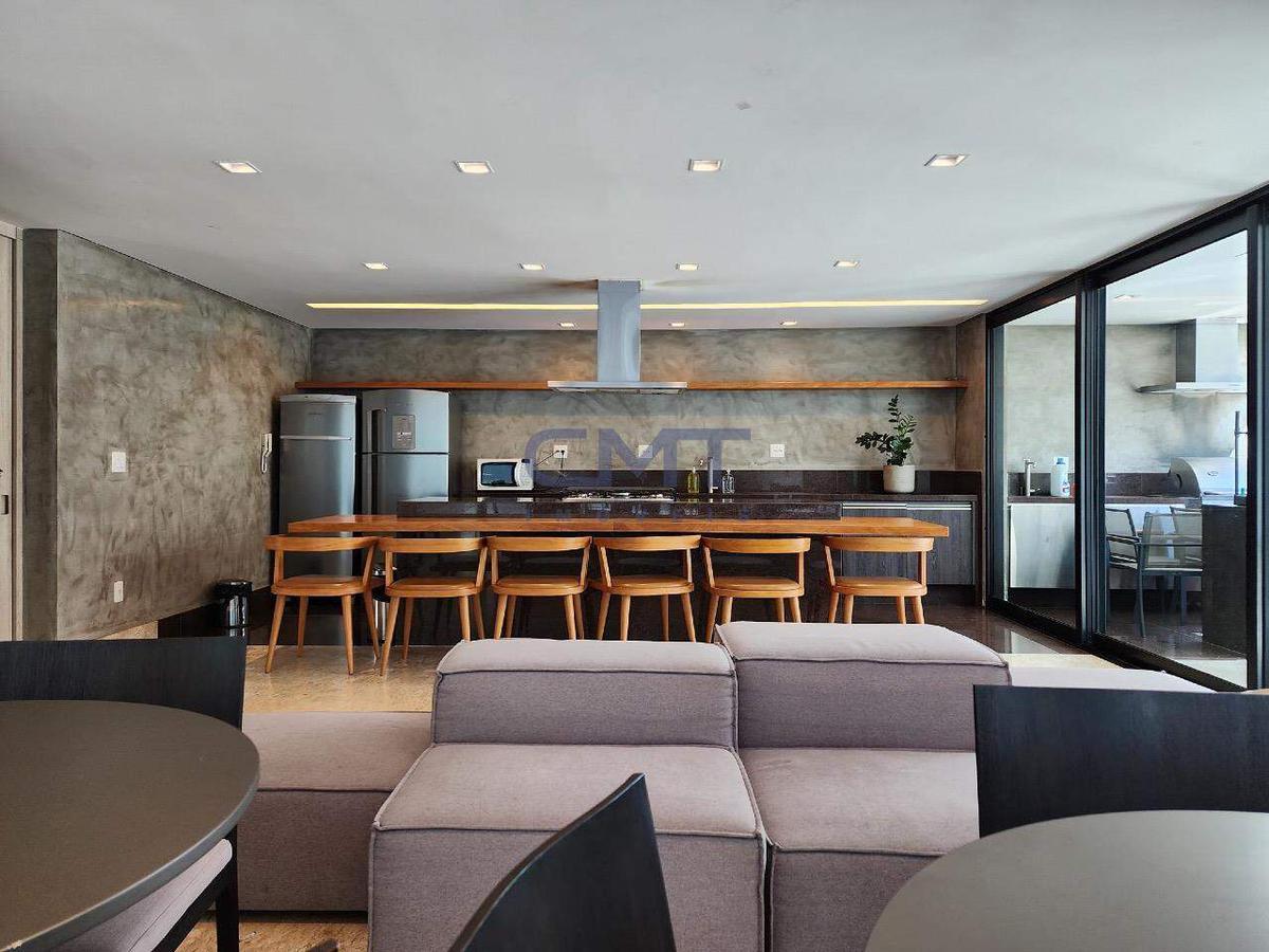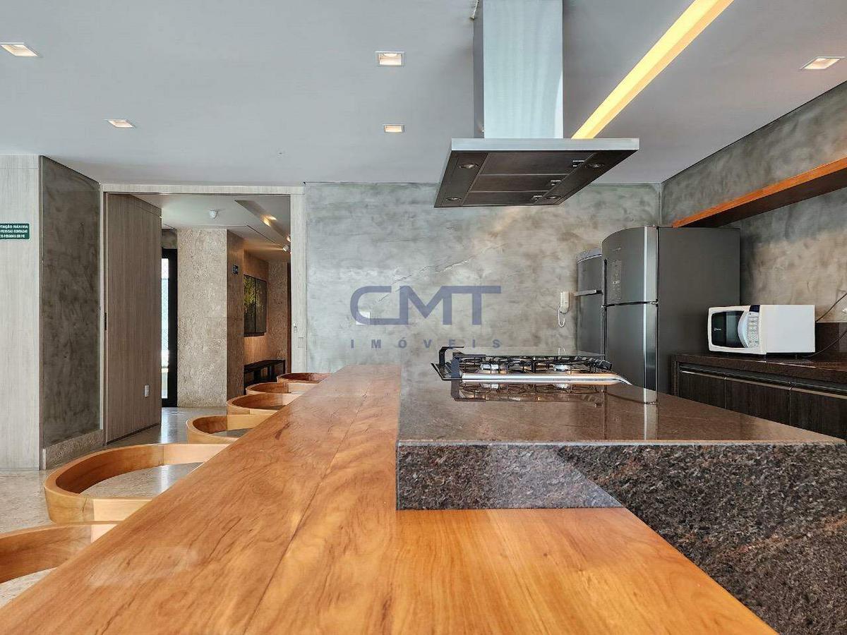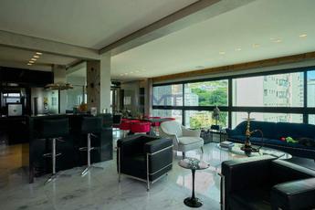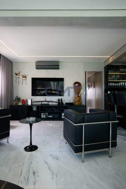 Sala bastante ampla, comportando diversos ambientes. Todo o ambiente foi projetado para transmitir o máximo de requinte, a partir do piso sendo todo em mármore, o projeto de iluminação, marcenarias com acabamento laqueado, cortinas com fechamento eletrônico que revelam as janelas panorâmicas do ambiente, lavabo com bancada em mármore e cuba em pedra esculpida. Tudo isso proporciona uma experiência de moradia exclusiva.