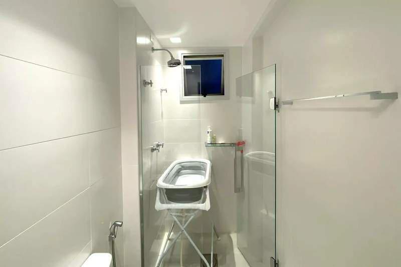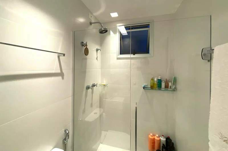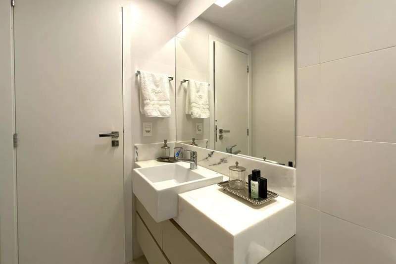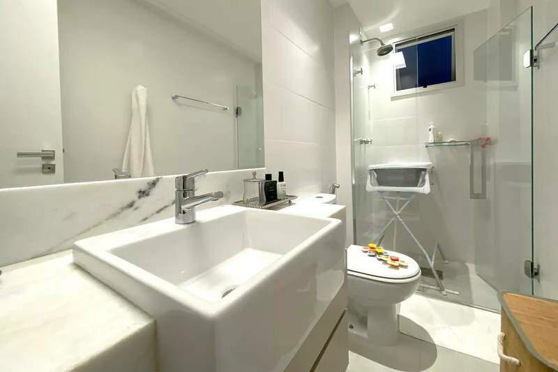 Banheiro social com espelho, bancada em granito, armários e box em blindex