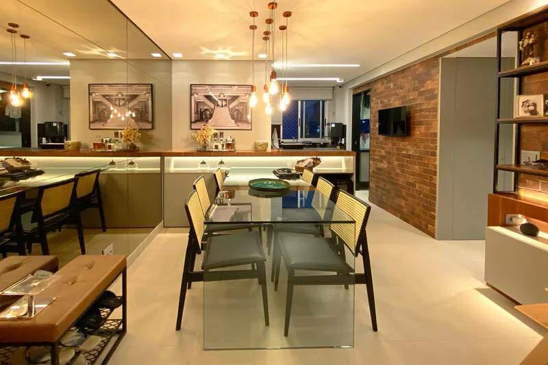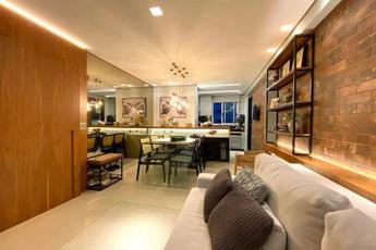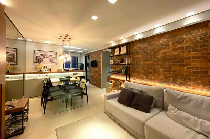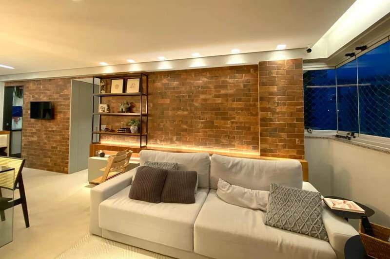 1 Sala ampla para dois ambientes, toda decorada, com piso em porcelanato e teto com rebaixamento em gesso