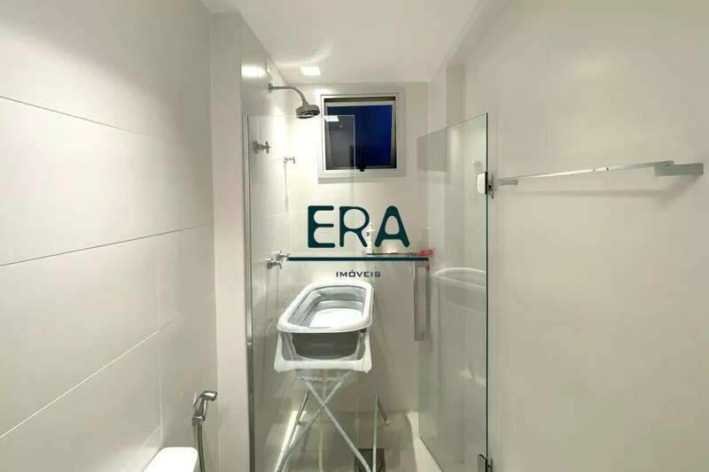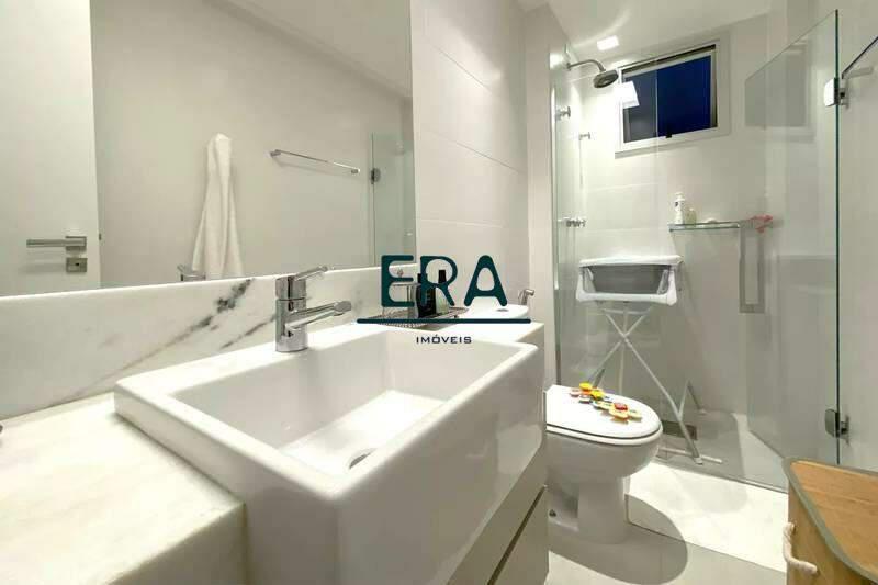 Banheiro social com espelho, bancada em granito, armários e box em blindex