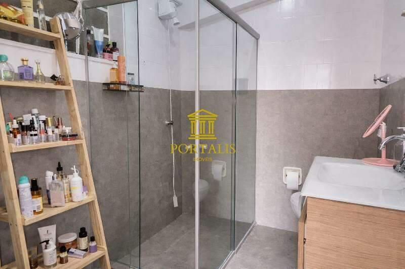 Banheiro social com bancada, espelho, armários e box em blindex