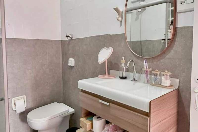 Banheiro social com bancada, espelho, armários e box em blindex