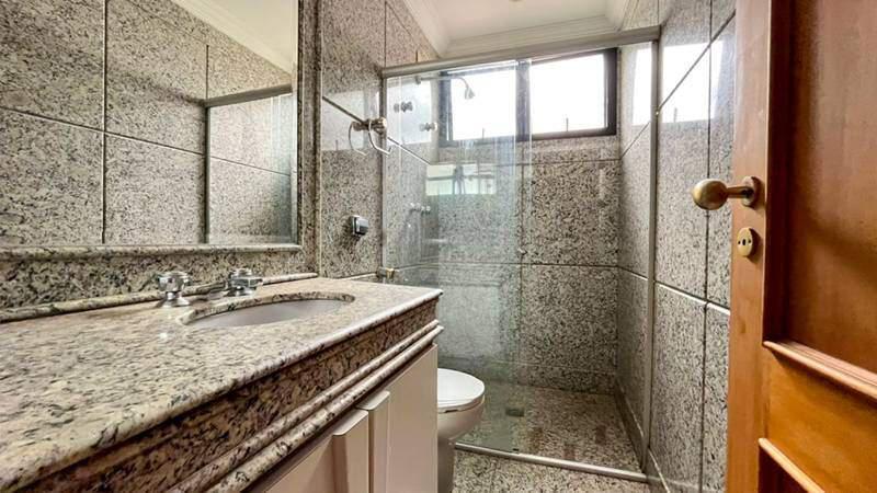 Banheiros (social e suítes) com armários, espelhos e box em vidro blindex.