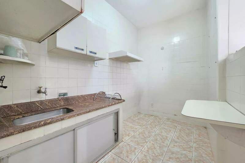Cozinha espaçosa com piso em cerâmica, bancada em granito e armários