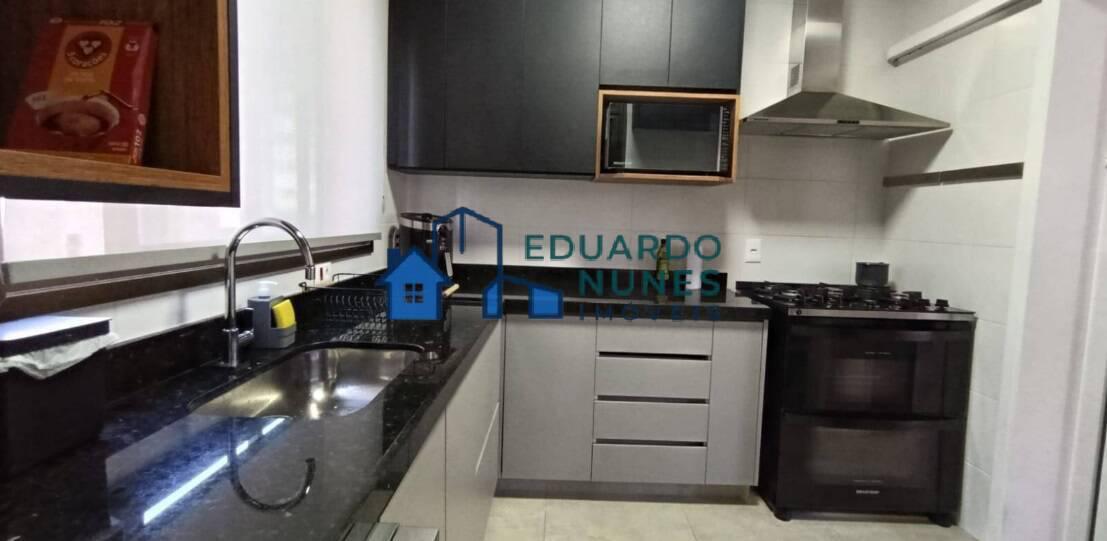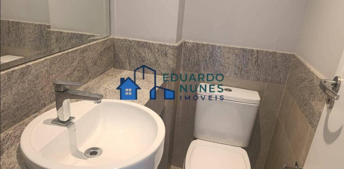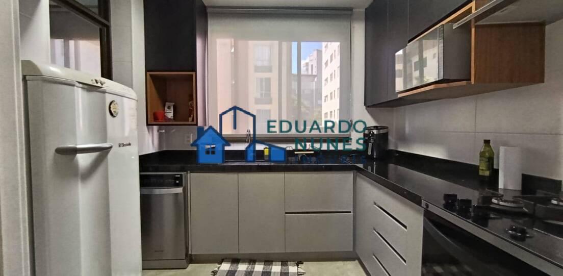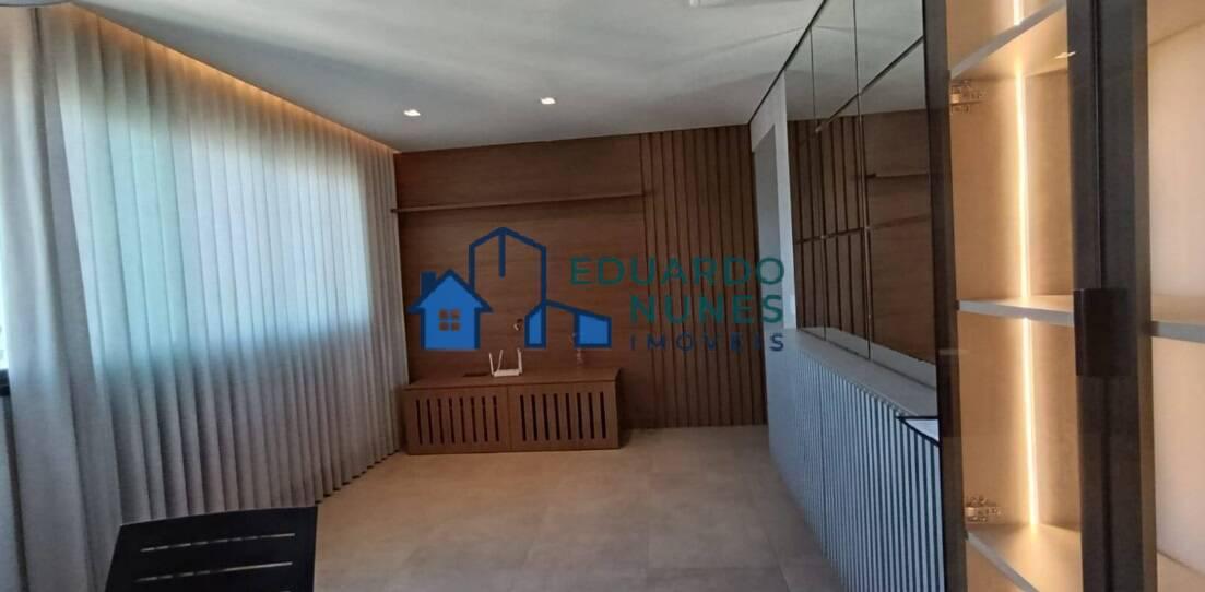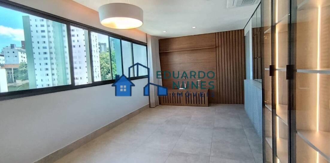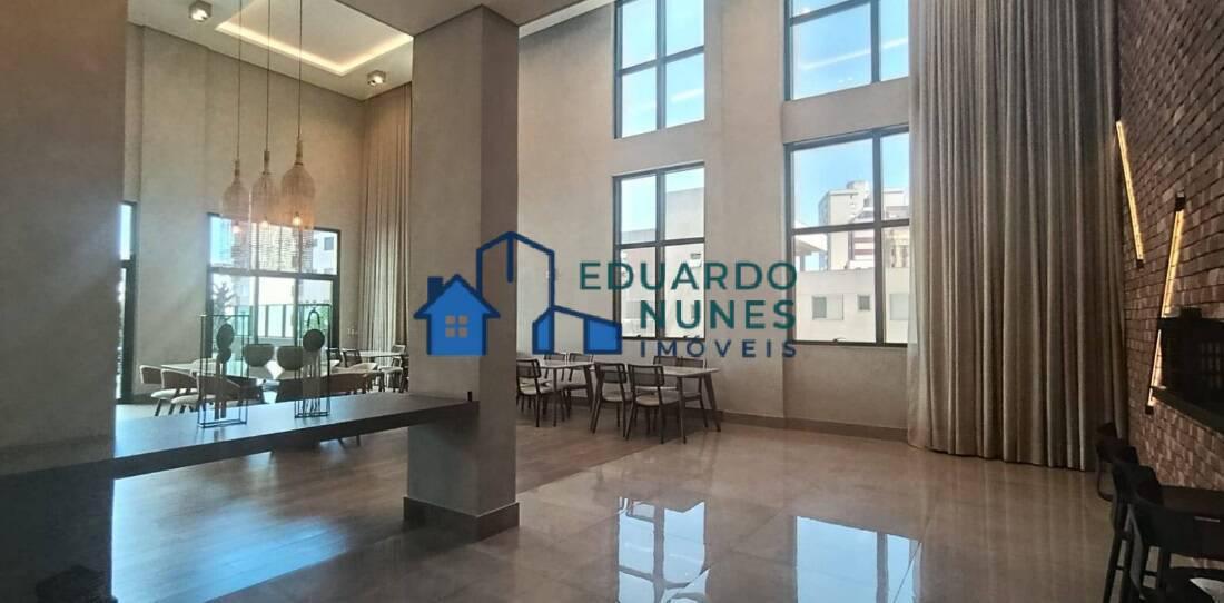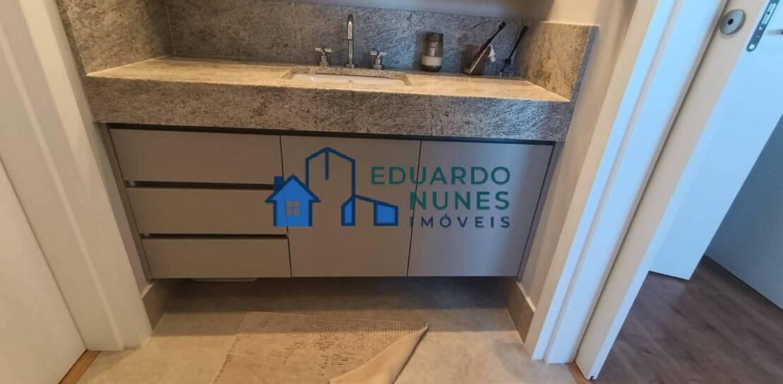 O apartamento conta com uma ampla sala para dois ambientes, climatizada com ar-condicionado, lavabo e acabamento refinado com bancadas em granito.