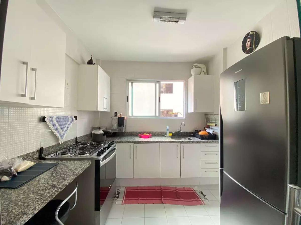 A cozinha é espaçosa e bem planejada, com armários sob medida, bancada em granito e piso em cerâmica.