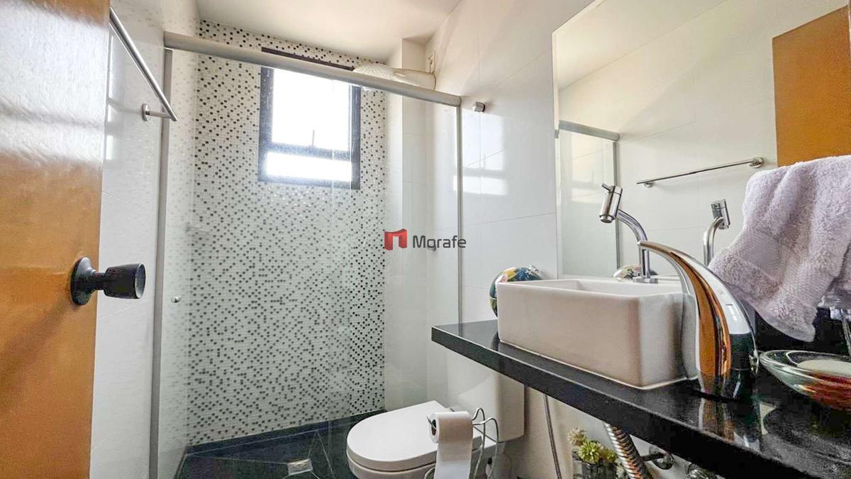 Banho Social: Banheiro social com bancada em granito, piso em porcelanato, box de vidro temperado e espelho, garantindo conforto para todos os moradores.