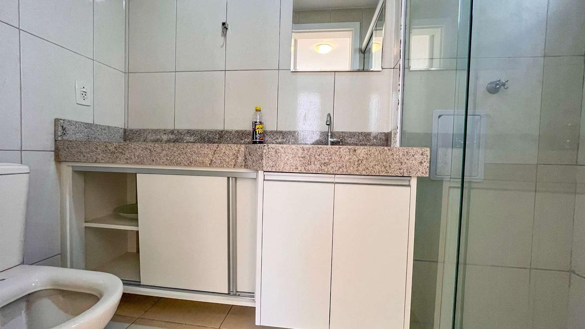 Banheiros (social e suíte) com armários planejados, box em blindex e acabamento em cerâmica.