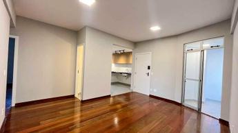 Sala ampla para dois ambientes, com piso em tábua corrida e varanda integrada que proporciona luminosidade natural e ventilação.