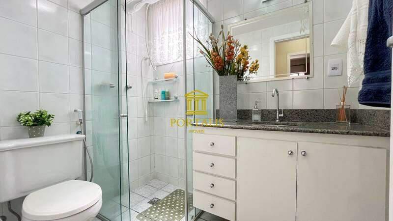 Banheiros (social e suíte) com acabamento em cerâmica, armários planejados, espelhos e box em blindex.