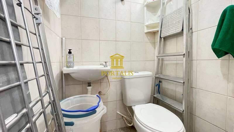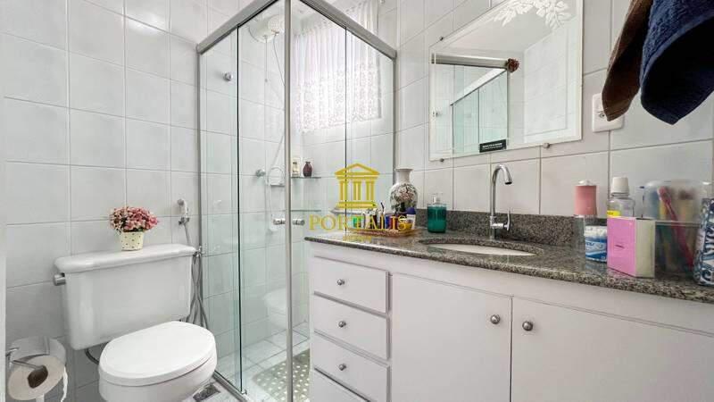 Banheiros (social e suíte) com acabamento em cerâmica, armários planejados, espelhos e box em blindex.