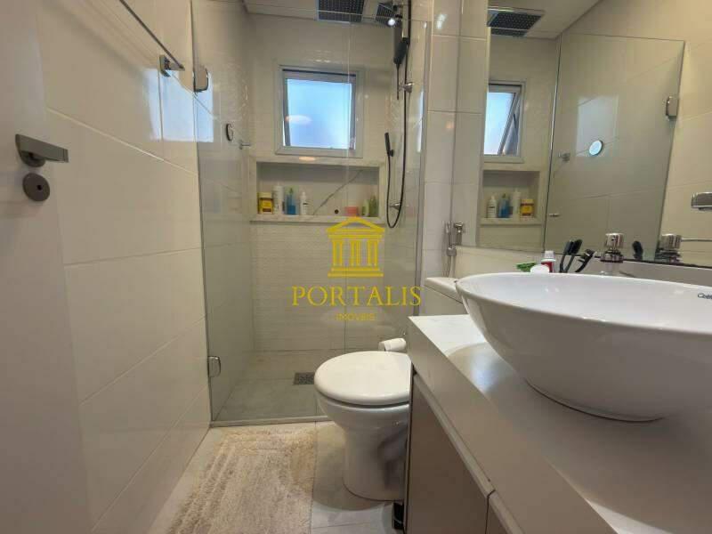 * Banheiro social com bancada em granito, pia em cuba, espelho, armários e box em blindex;
