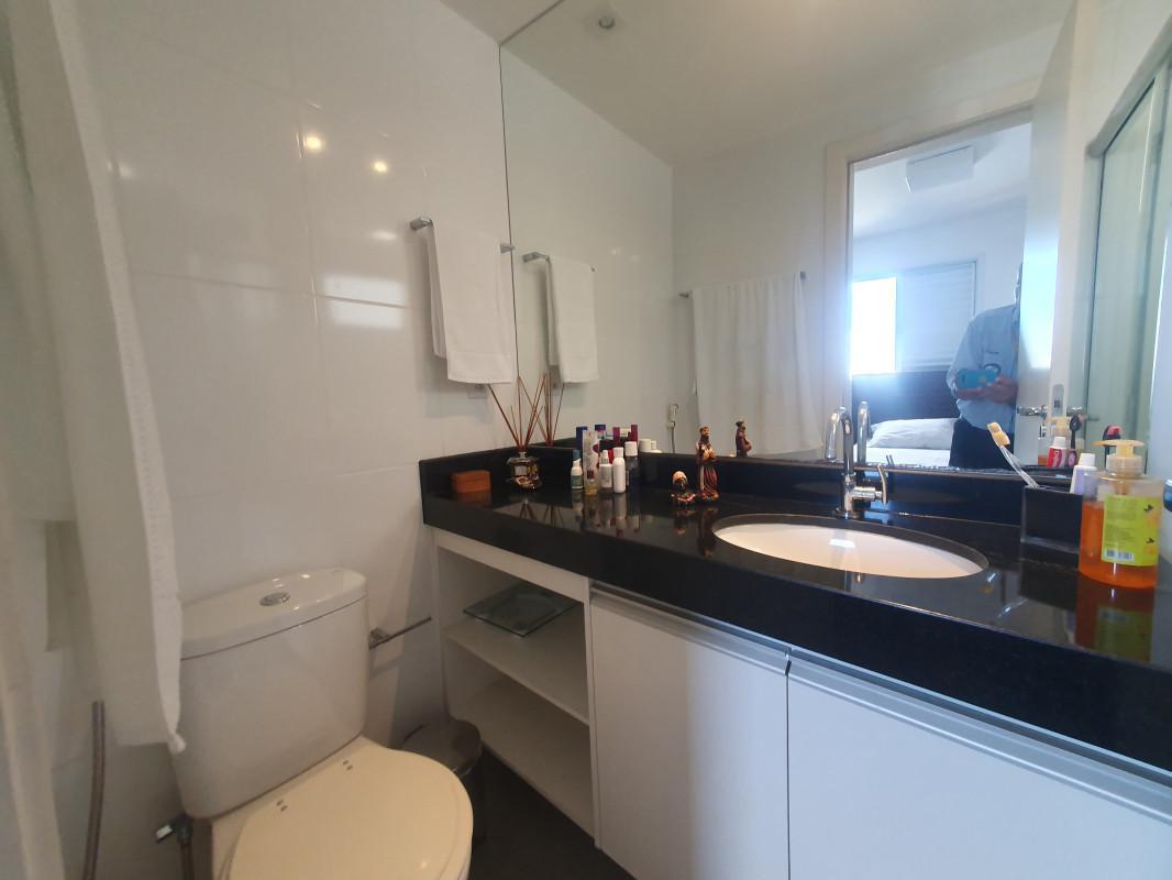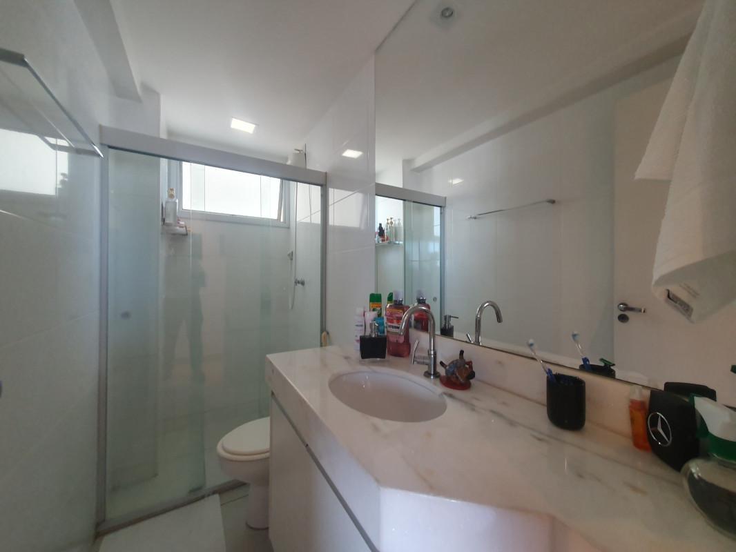 Banho social com armários, bancada em mármore e box blindex;