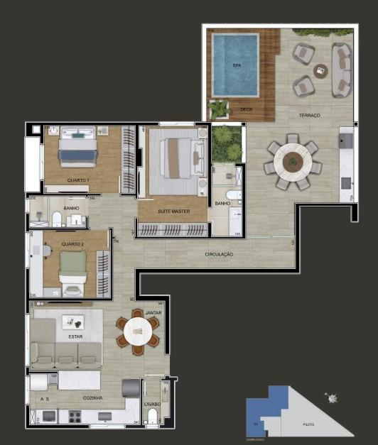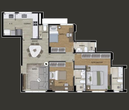 Sala ampla para 02 ambientes, lavabo, 03 quartos confortáveis sendo 01 suite, banheiro social, cozinha espaçosa e planejada com bancadas em granito e área de lavanderia independente