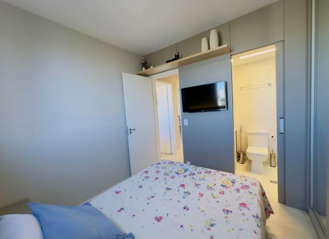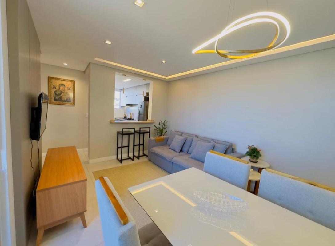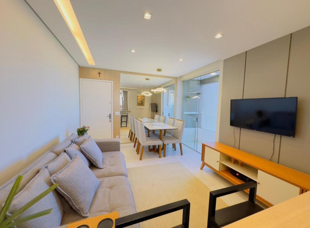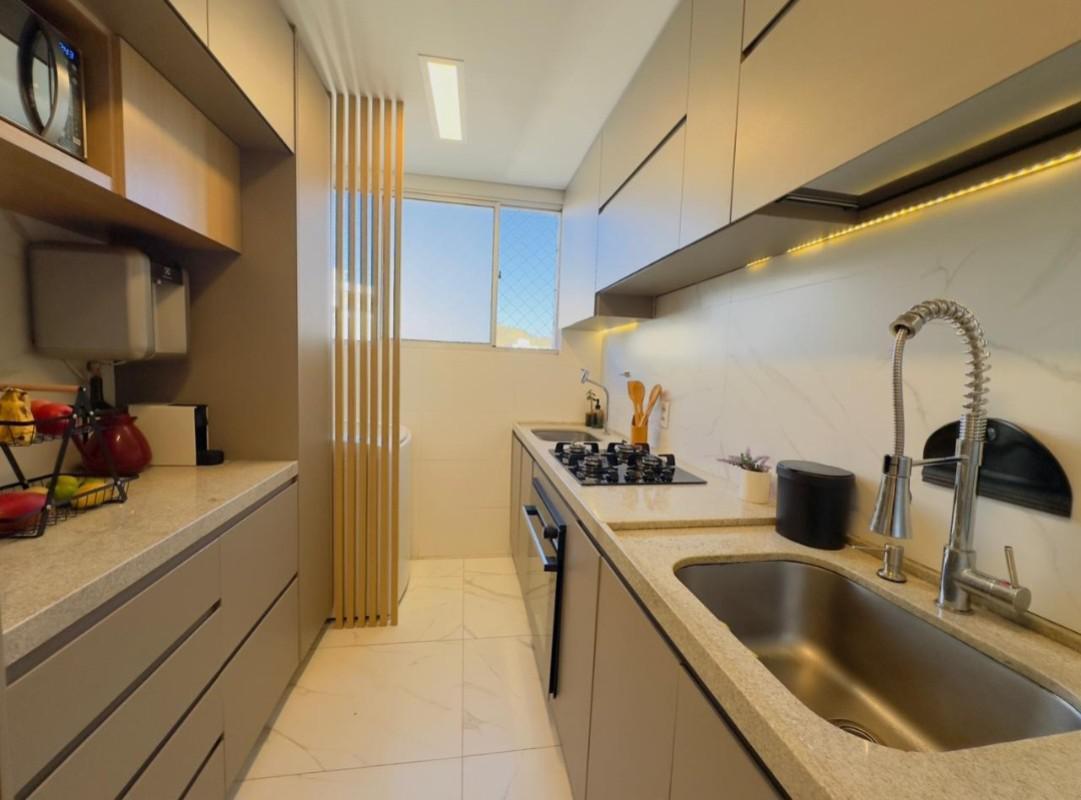 O imóvel conta com uma sala ampla para dois ambientes, varanda e acabamento de alto padrão, com teto rebaixado em gesso. São três quartos, sendo um suíte com armário, cozinha com armários planejados e área de serviço separada. Além disso, o apartamento possui duas vagas em linha, demarcadas e cobertas.