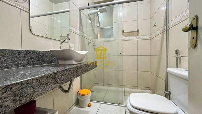 * Banheiro social com bancada em granito, box em blindex e espelho
