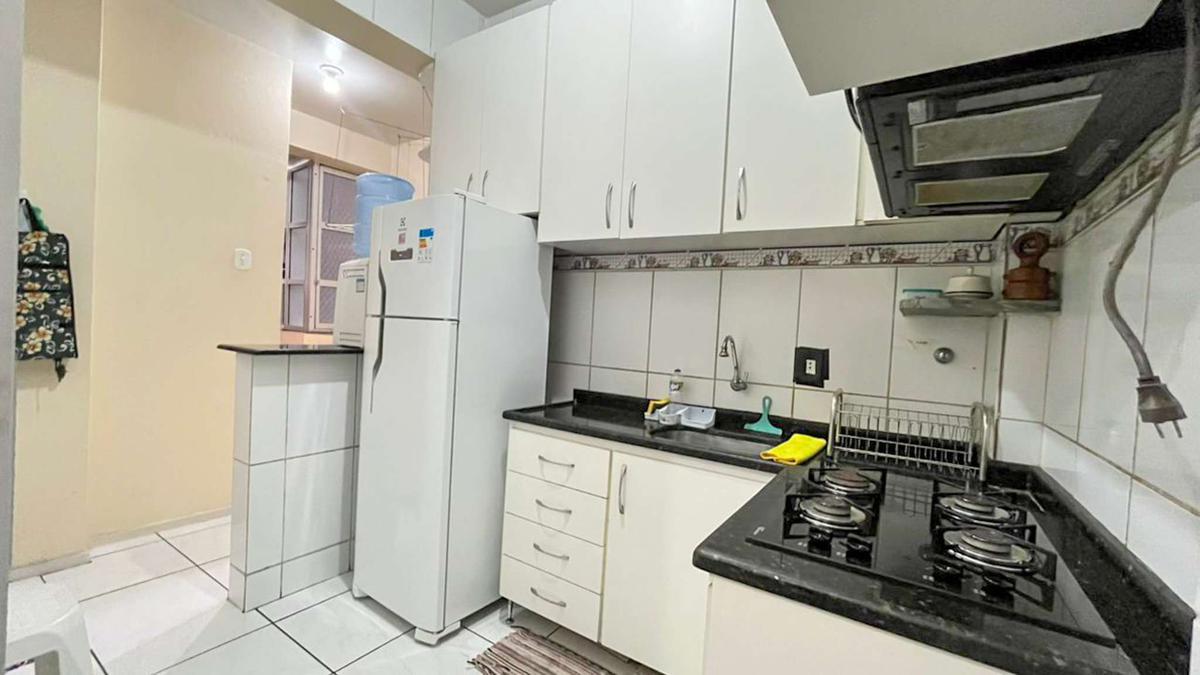 Cozinha ampla com piso em cerâmica, bancada em granito e armários