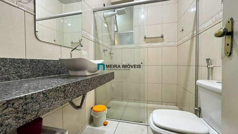 Banheiro social com bancada em granito, pia em cuba de apoio, espelho e box em blindex