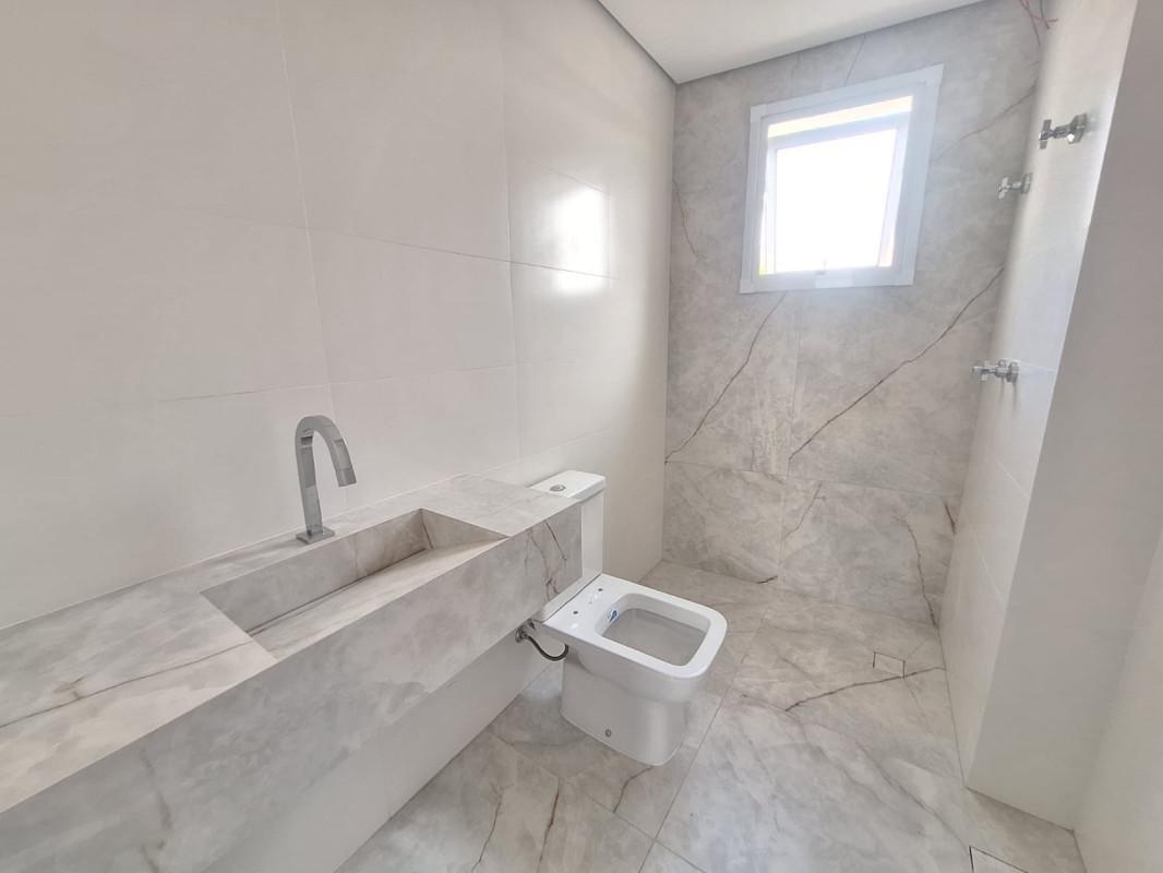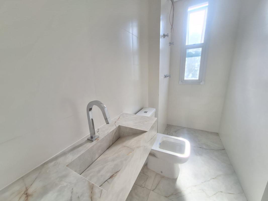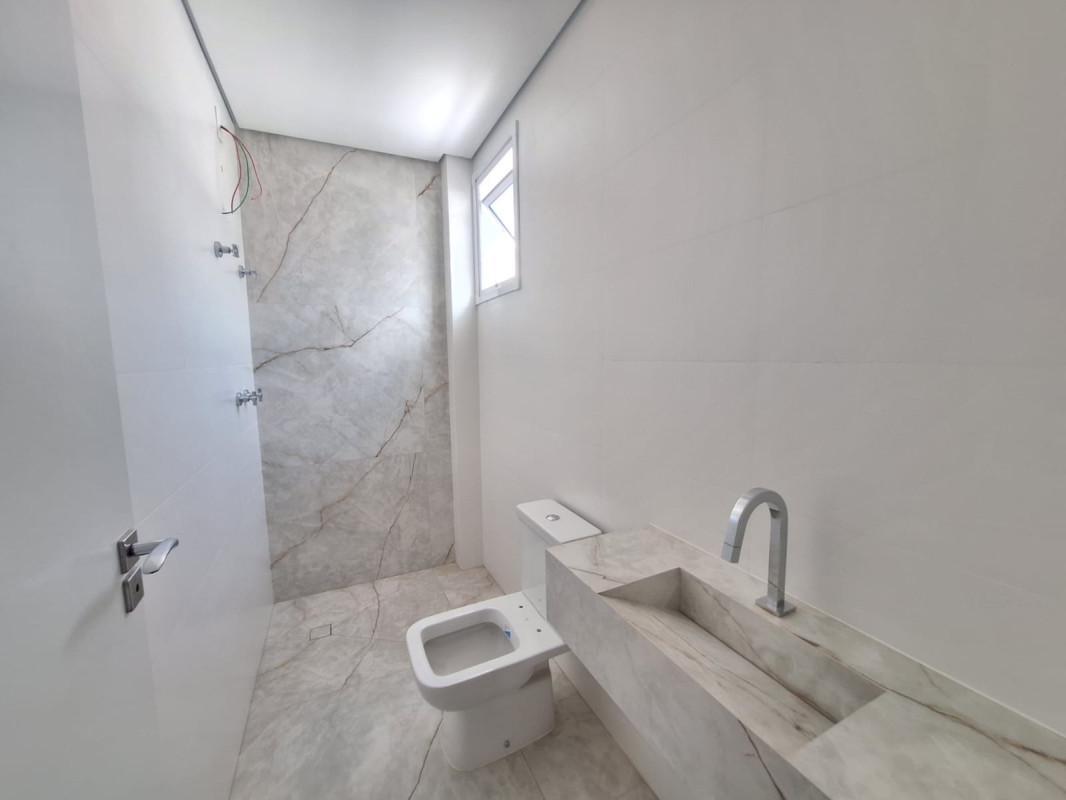 Banho social com bancada e piso porcelanato,