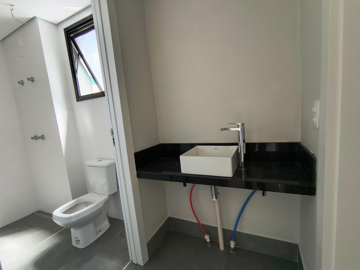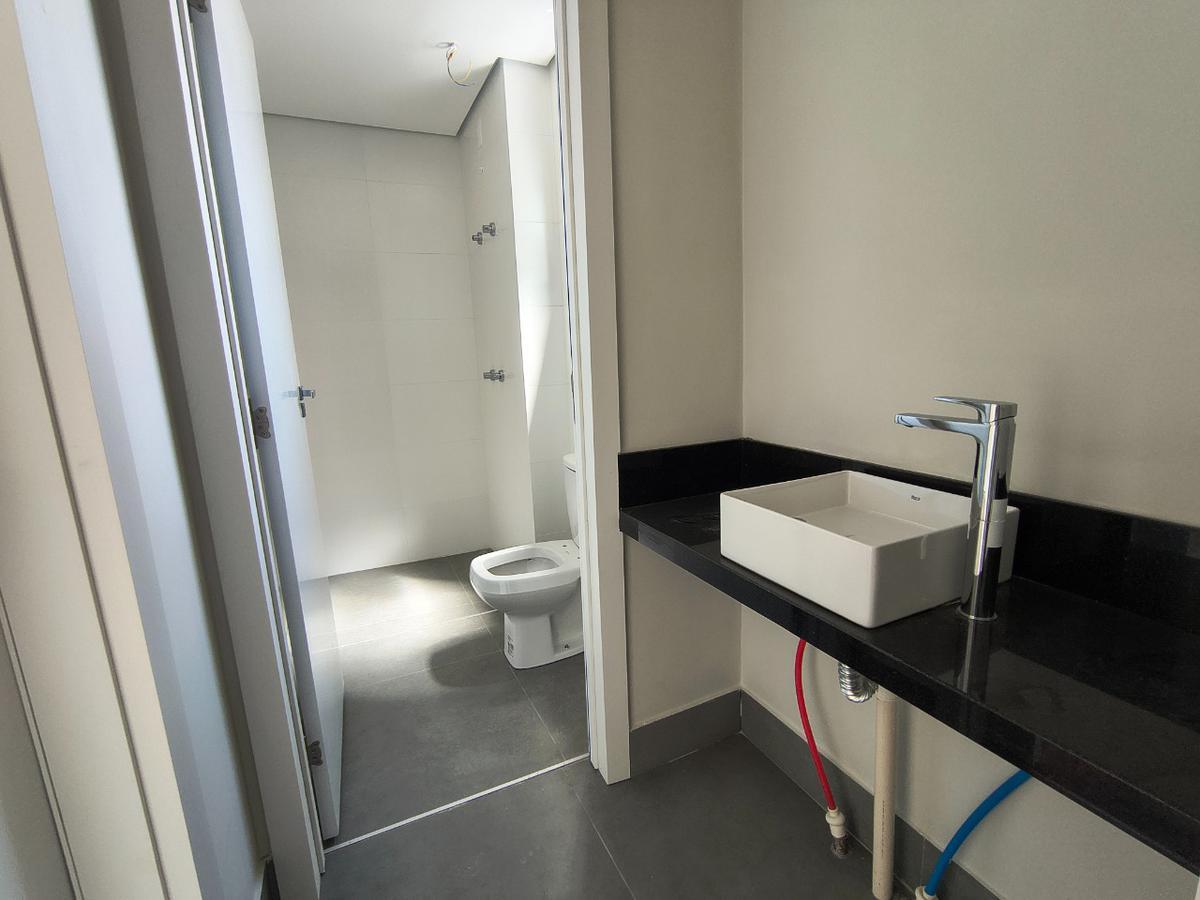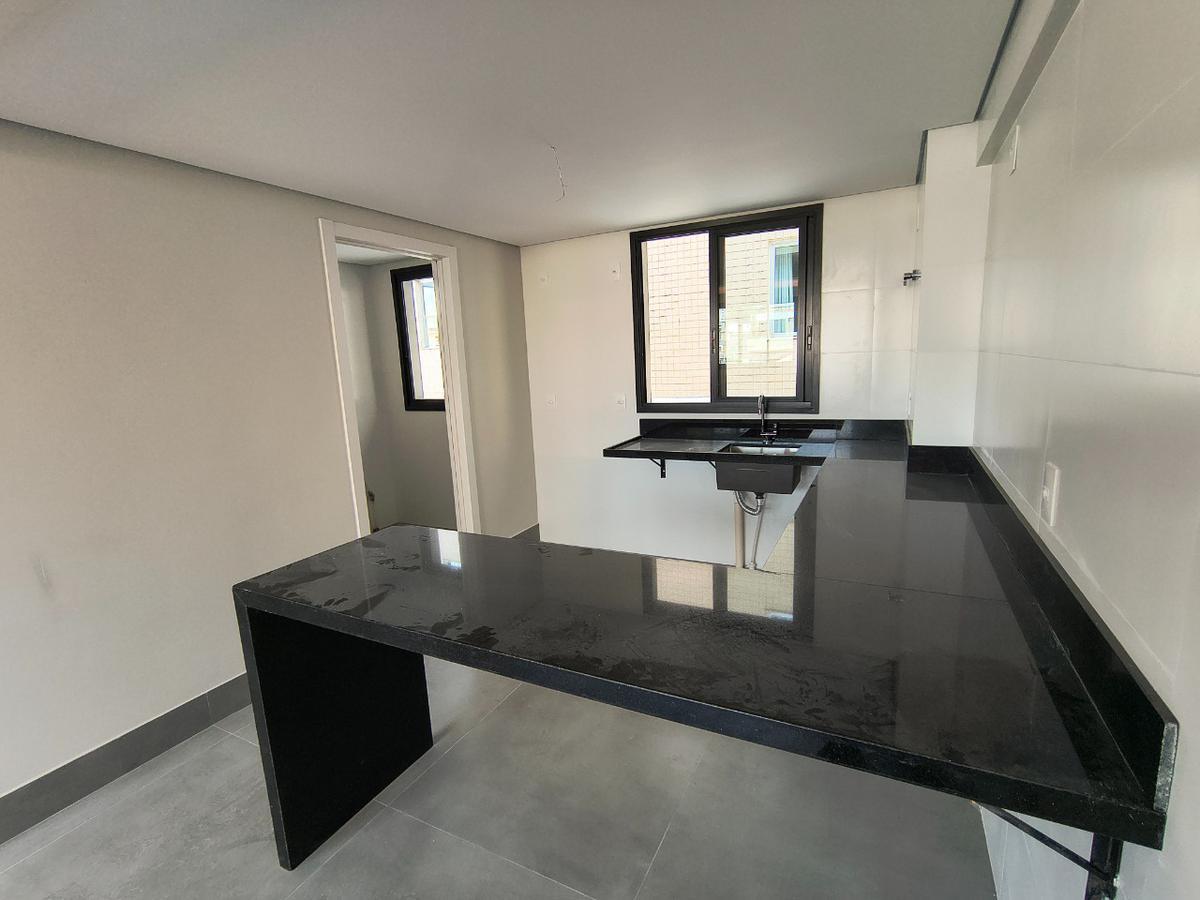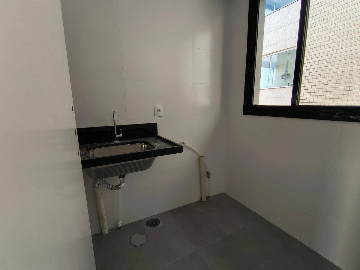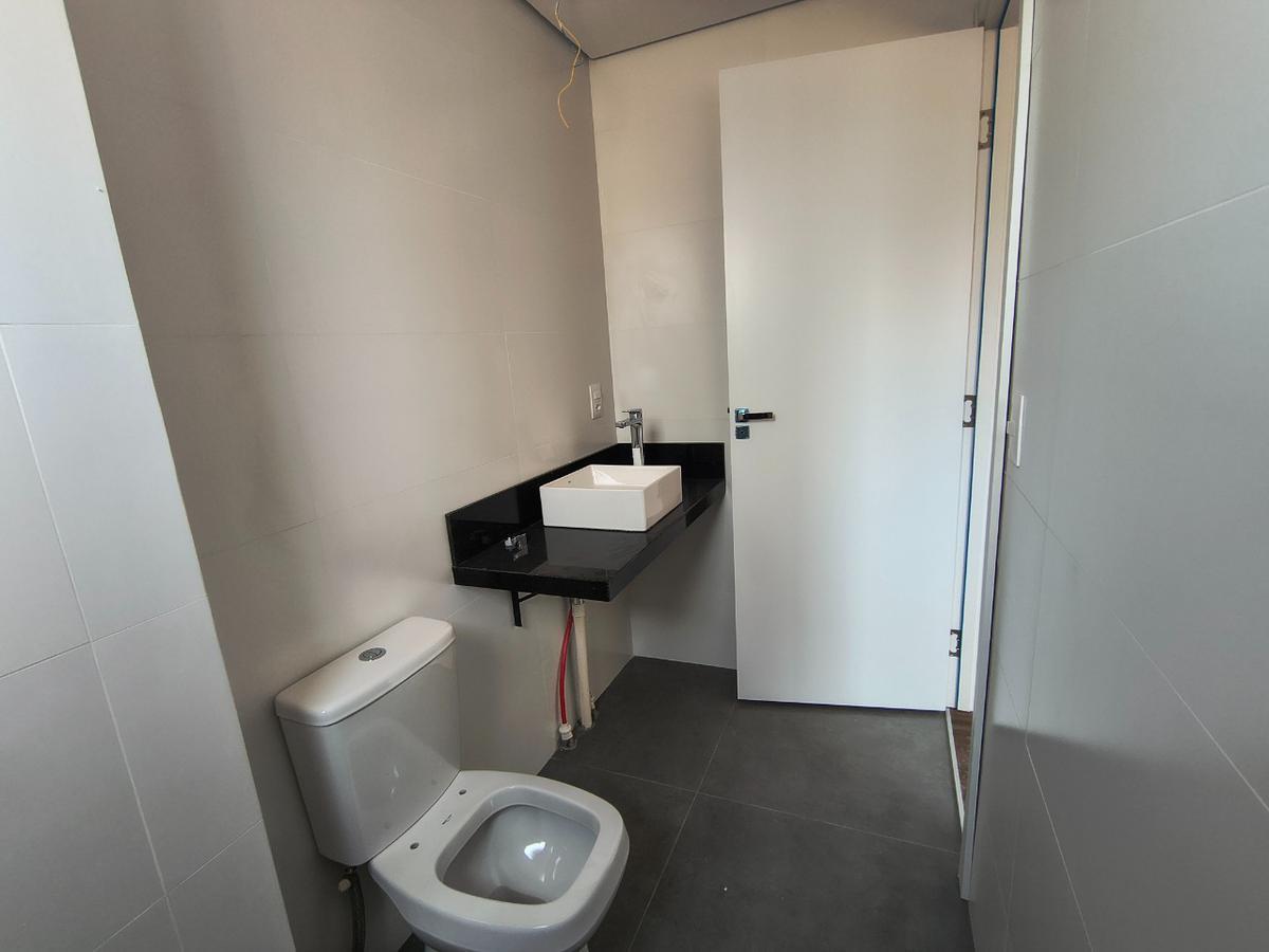 A área social conta com ampla sala integrada à cozinha americana, proporcionando um ambiente moderno e funcional. A cozinha possui bancadas em granito e piso em porcelanato, além de ótima iluminação natural graças à grande janela, que também garante excelente ventilação. A área de serviço é independente e há ainda lavabo de apoio à sala.
