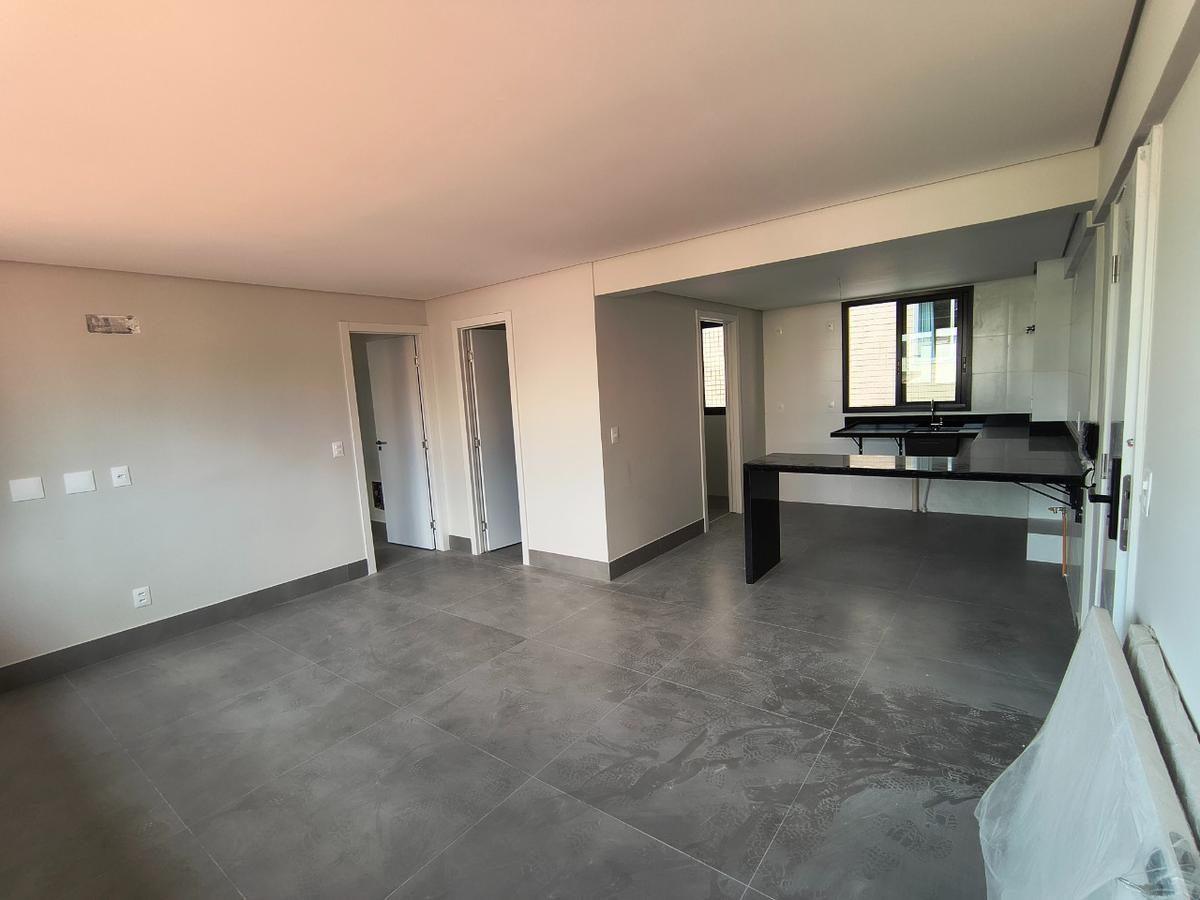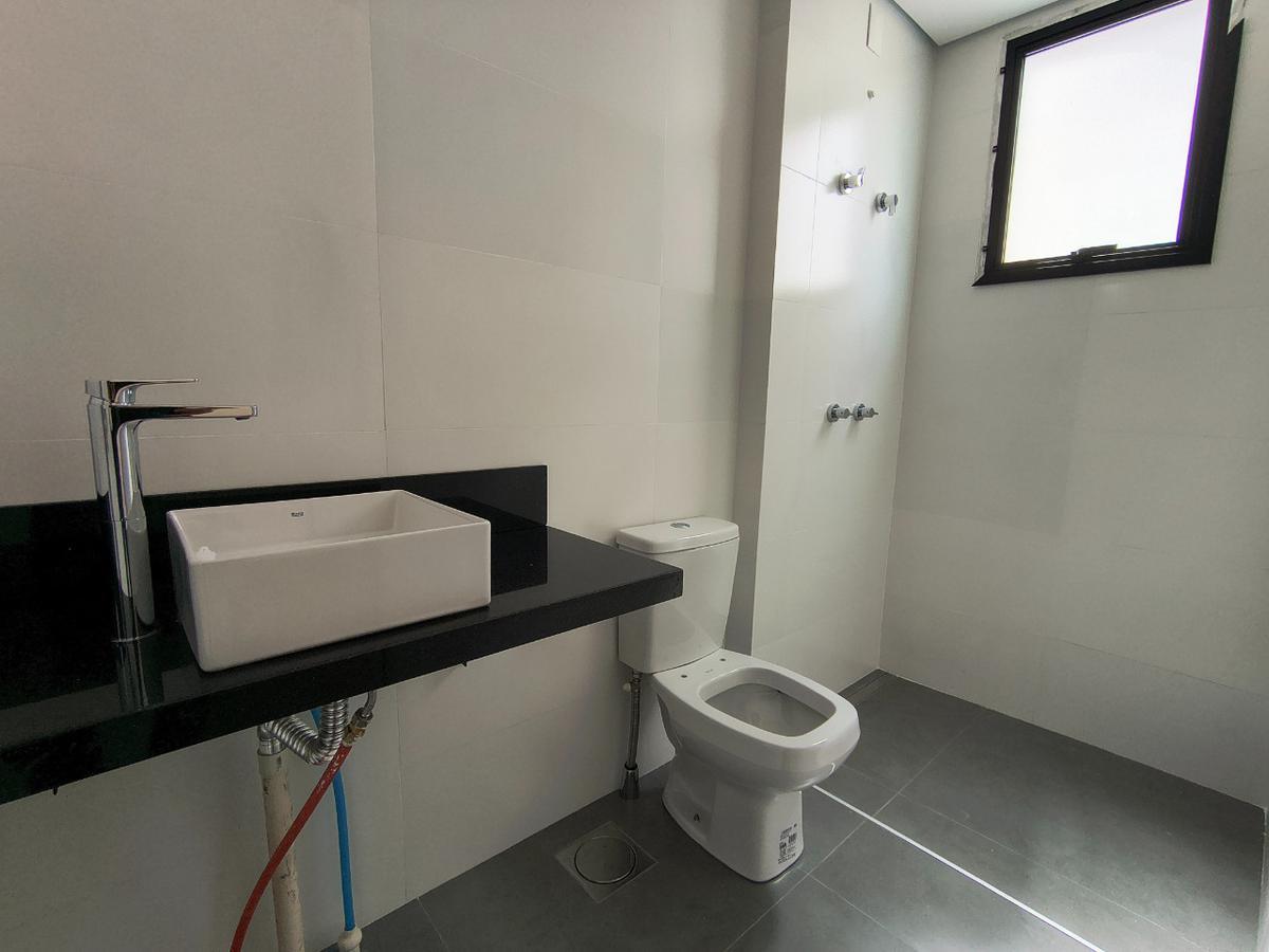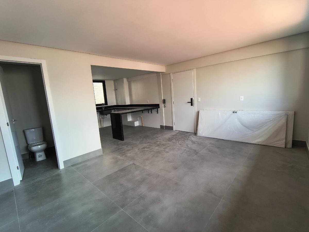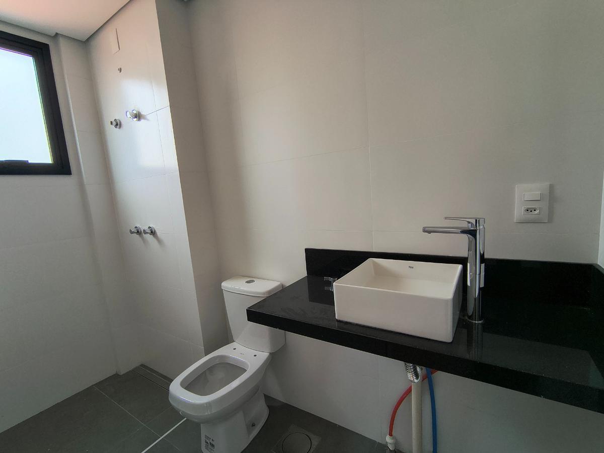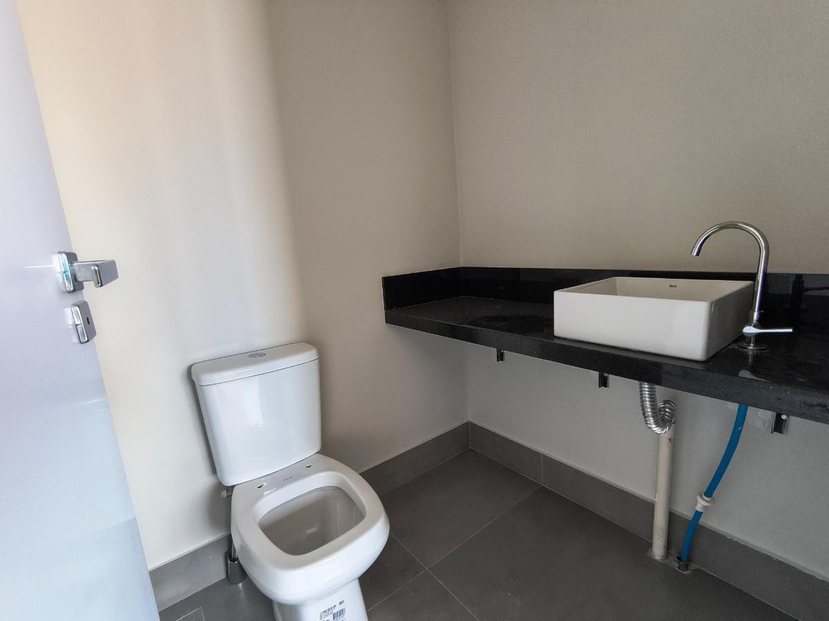A área social conta com ampla sala integrada à cozinha americana, proporcionando um ambiente moderno e funcional. A cozinha possui bancadas em granito e piso em porcelanato, além de ótima iluminação natural graças à grande janela, que também garante excelente ventilação. A área de serviço é independente e há ainda lavabo de apoio à sala.