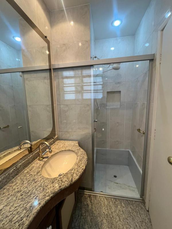 Banho social e suíte com armários planejados, box de vidro temperado e espelhos;
