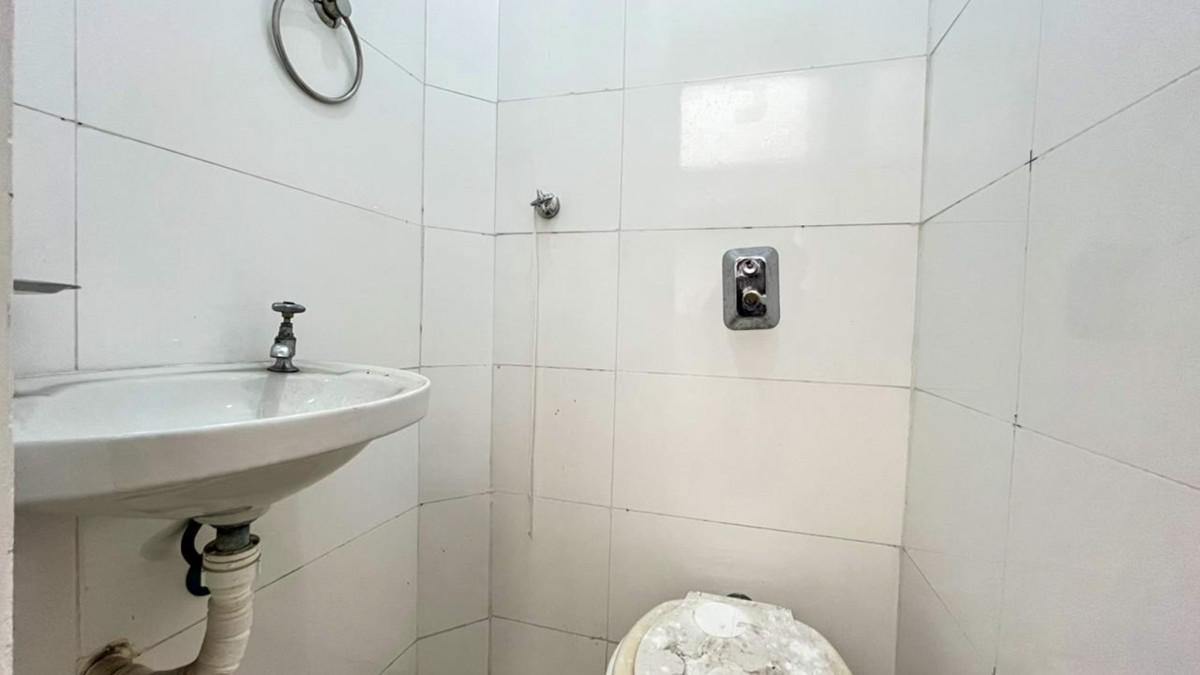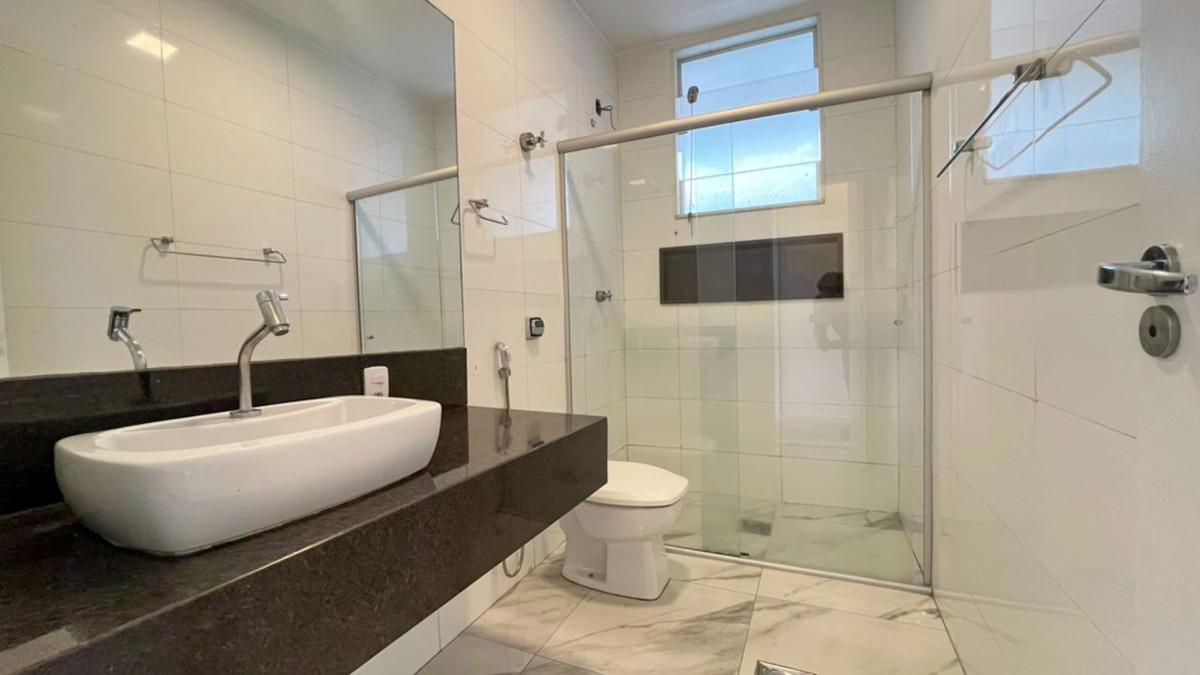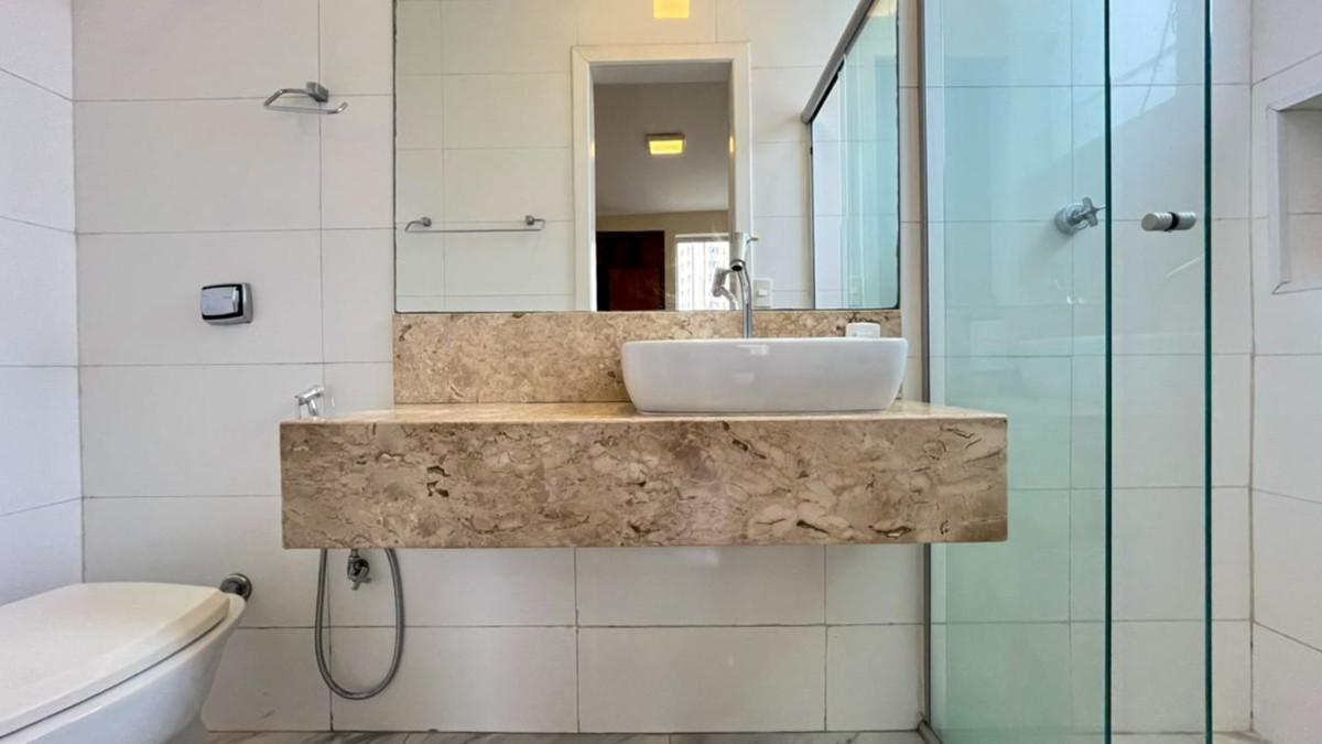 Banhos da suíte e social com bancada em granito, espelho e box em blindex;