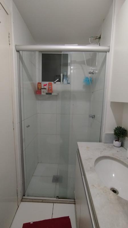 Banheiros com armários, box em blindex e acabamento em granito, combinando elegância e durabilidade.