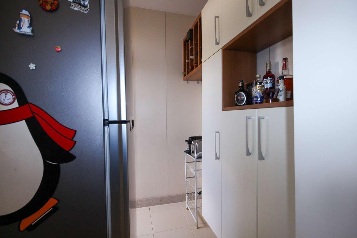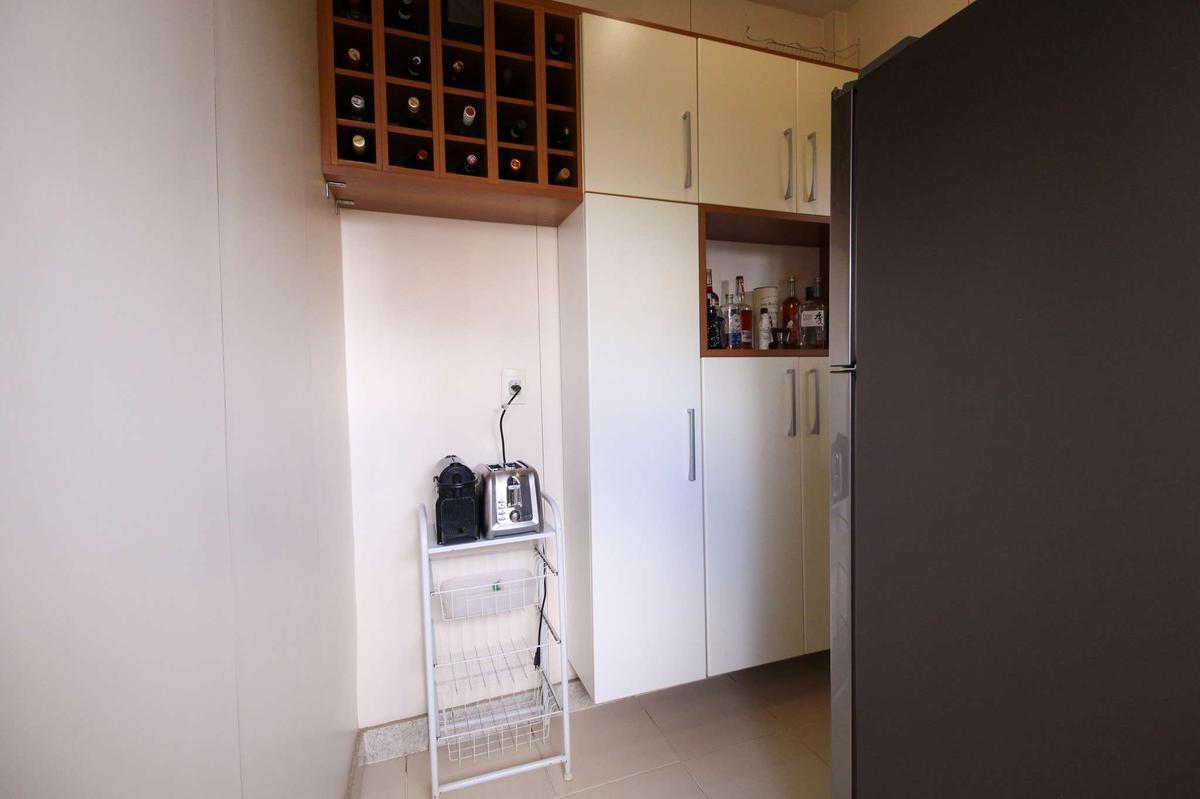 Cozinha: Revestida em fórmica, com armários planejados, piso em porcelanato e bancadas em granito, proporcionando funcionalidade e sofisticação.