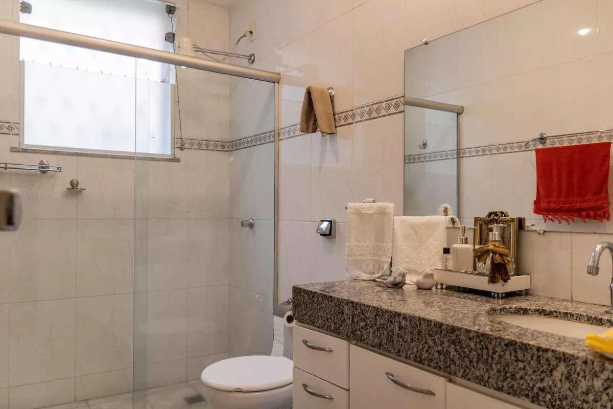 Banho social e suíte com ótimo acabamento, armários, espelhos e box em blindex.