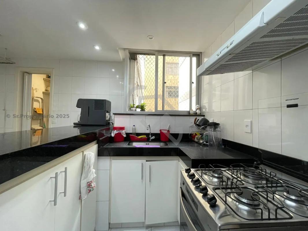 Cozinha aberta, equipada com armários planejados e bancada em granito.