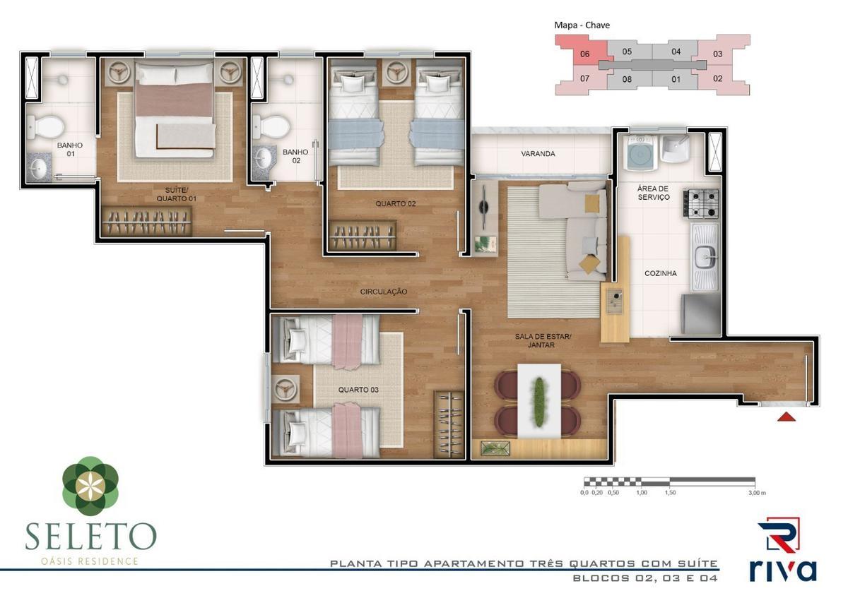 - 3 quartos, sendo uma suíte;