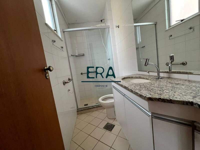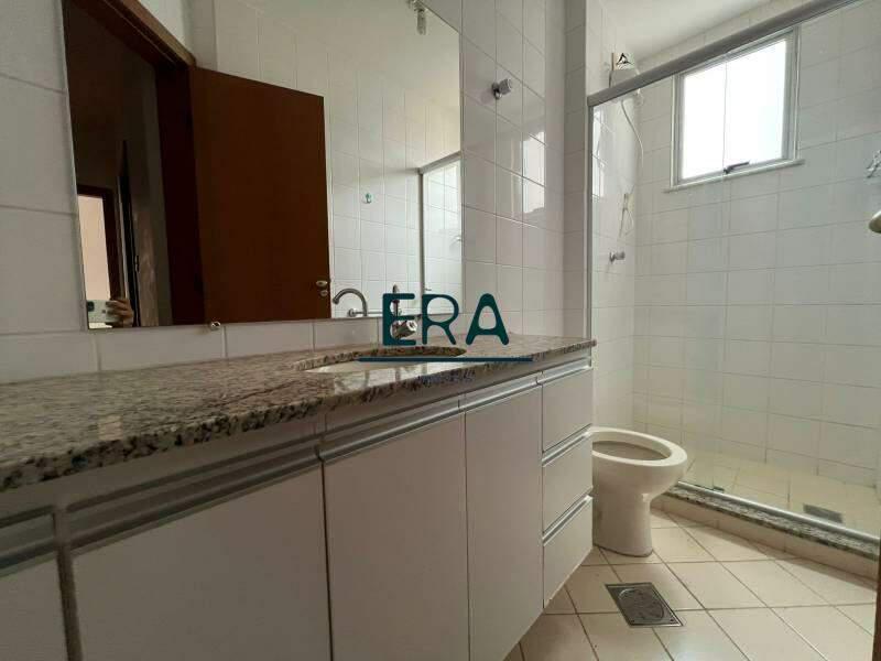 Banheiros com bancada em granito, espelhos, box em blindex e armários