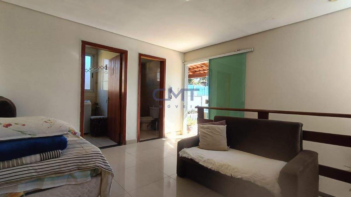 No piso superior, há uma segunda sala, um banheiro, área de serviço e área externa aberta.