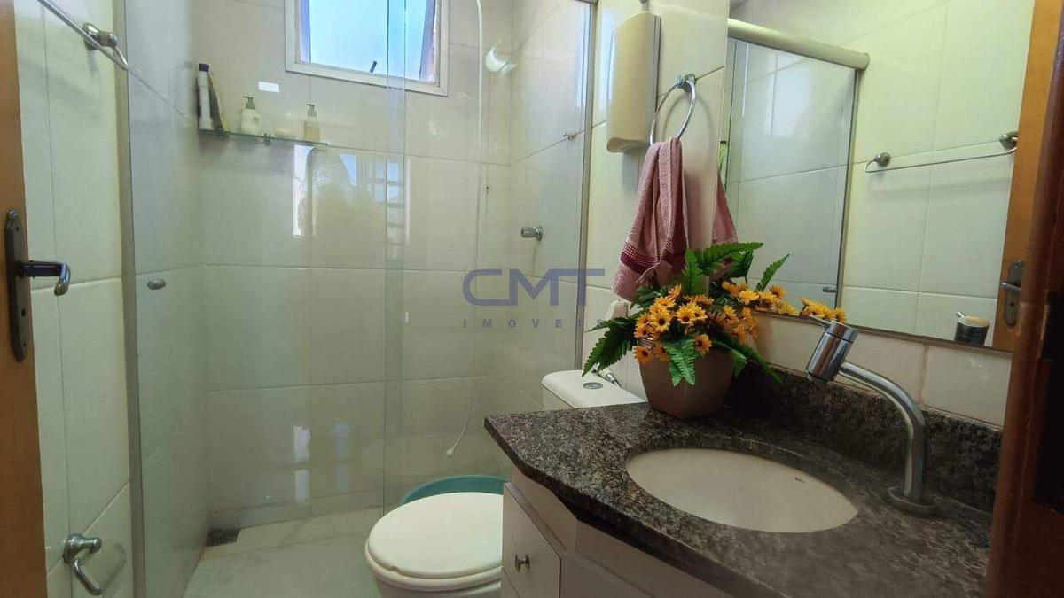 No andar inferior, o imóvel conta com sala, 3 quartos (sendo 1 suíte com armário), 1 quarto com armário adicional e 1 quarto sem armário. Banho social com piso e paredes em cerâmica.