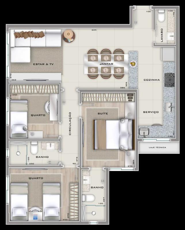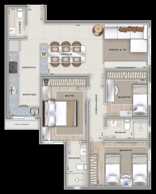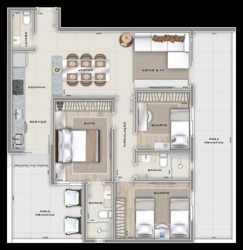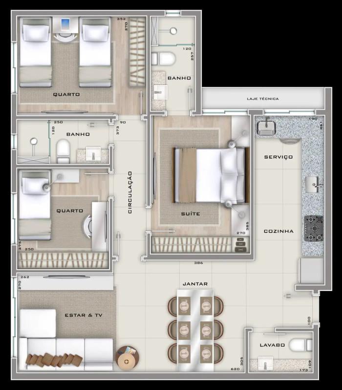 O apartamento conta com uma área social muito bem aproveitada, com integração inteligente entre os ambientes. A sala ampla para dois ambientes possui piso em porcelanato e excelente aproveitamento da iluminação natural. Os 3 quartos possuem piso vinílico com isolamento acústico e janelas com venezianas integradas, garantindo privacidade e tranquilidade. Os banheiros, incluindo a suíte, social e lavabo, possuem ventilação natural e acabamento em porcelanato.