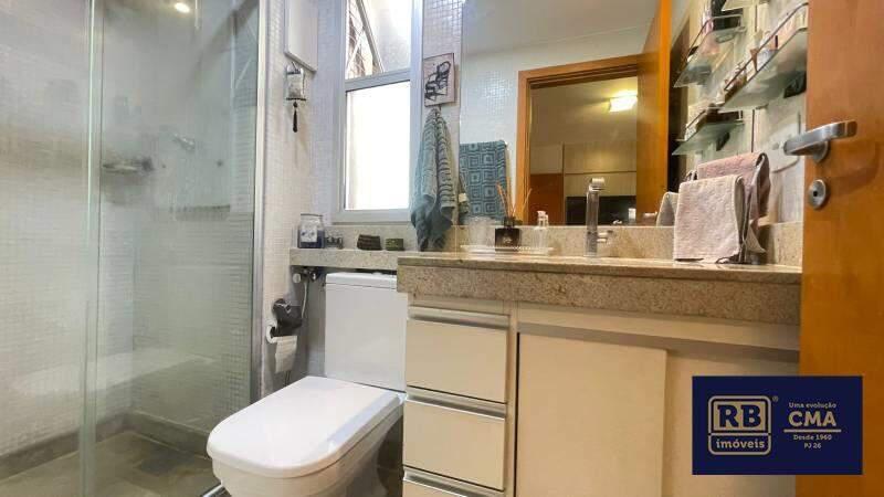 Banheiros (social e suíte) com armários, espelhos e box em vidro temperado