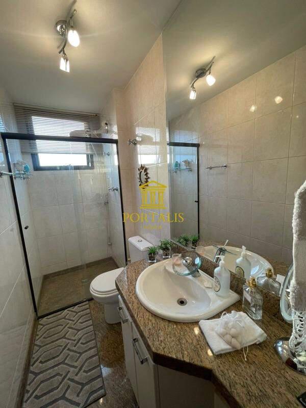 Banho social com bancada em granito, armário, espelho e box em blindex