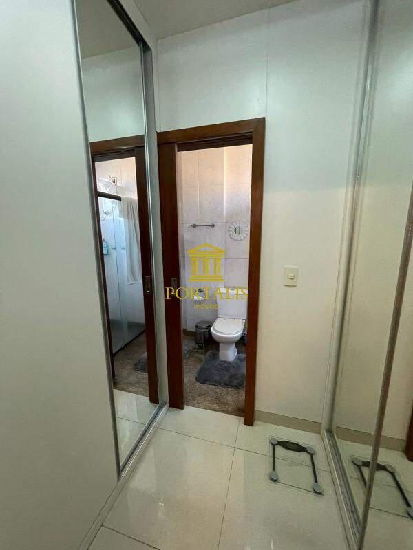 1 suíte com closet, banho com bancada em granito, armário, espelho e box em blindex