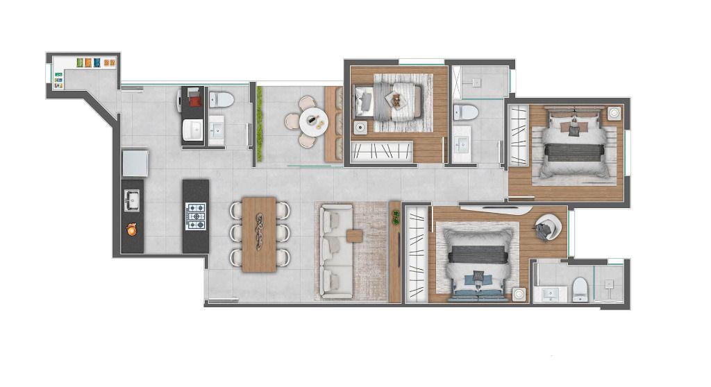 Os apartamentos oferecem conforto e funcionalidade, com pisos em porcelanato nas áreas sociais, laminado nos quartos, cozinhas e banheiros com revestimentos cerâmicos, bancadas em granito ou mármore, além de infraestrutura para medição individualizada de água, gás na cozinha e previsão para instalação de ar-condicionado na suíte.