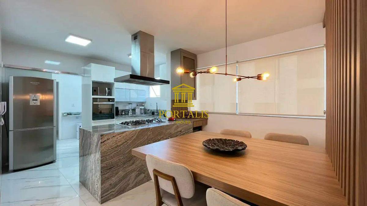 Cozinha planejada, integrada à sala de jantar, equipada com armários sob medida, bancadas em mármore, coifa e piso em porcelanato.
